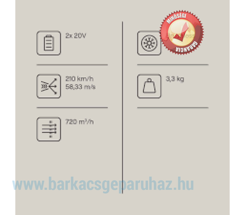 Erőteljes akkus lombfúvó 4 az 1-ben funkcióval: szívás, fúvó és aprító funkcióval, valamint beépített gyűjtőzsákkal Rugalmasság az egységes akkumulátorrendszernek köszönhetően – egy akkumulátor a teljes gomag 20 V sorozathoz Karbantartást nem igénylő kefe nélküli motor – hosszú élettartamú, kefe nélküli motor nagy hatékonysággal, hosszabb üzemidővel az alacsony kopásnak köszönhetően Erőteljes 2x 20 V (2x 20 V elem szükséges a működéshez) Nagy légsebesség 210 km/h és légmennyiség 720 m3/h 45 literes gyűjtőzsák betekintő ablakkal a töltésszint szabályozásához A 10:1 mulcsozási arány a kerti hulladékot könnyen kezelhető talajtakaróvá csökkenti Szerszám nélküli átkapcsolás fújásról szívás/aprítás üzemmódra kar segítségével Ergonomikus munkavégzés az állítható kiegészítő fogantyúnak és hordozópántnak köszönhetően Nagy vezetőkerekek a könnyű kezelhetőség érdekében Ergonomikus markolat csúszásmentes puha markolatfelülettel Tartalmaz 2x 4Ah akkumulátort és 2x töltőt