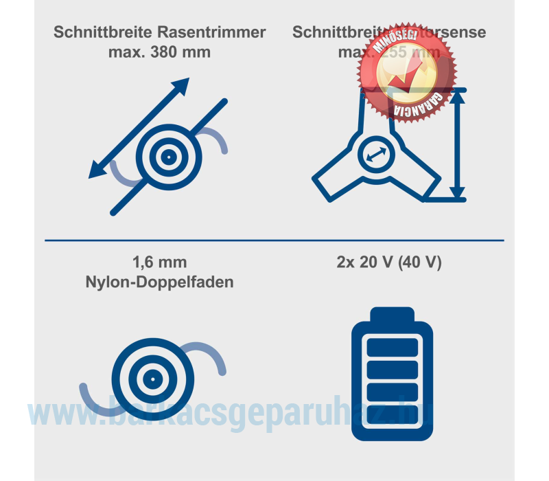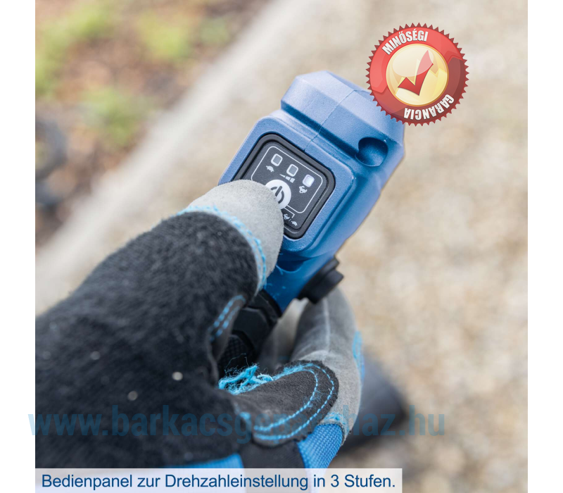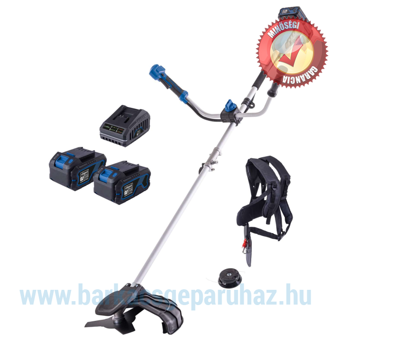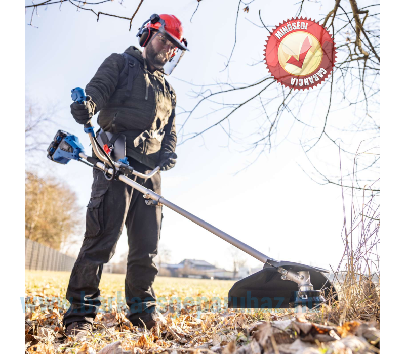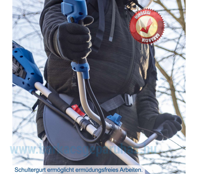A Scheppach BC-BCH380/40-X akkus bozótvágó egyetlen készülékben egyesíti a fűszegélynyírót és a bozótvágót, így ideális magas fű vagy sűrű aljnövényzet vágásához. Az állítható, kétkezes működtetésű, kerékpáros stílusú fogantyú és a vállpánt biztonságos, ergonomikus és hosszú élettartamú használatot biztosít. Az orsórögzítő rendszer lehetővé teszi a vágófelszerelés egyszerű cseréjét. A 3 fokozatú sebességszabályozásnak köszönhetően az optimális beállítás a helyi körülményekhez is lehetséges. Az akkus bozótvágót egy nagy teljesítményű, kefe nélküli motor hajtja. Ez a kefe nélküli motor különösen magas hatásfokot, hosszabb üzemidőt, hosszú élettartamot és csökkentett kopást biztosít. A Scheppach IXES 20 voltos sorozat részeként a rendszercsalád összes akkumulátora és töltője használható a BC-BCH380/40-X készülékkel. • Erős akkus bozótvágó – fűnyíró és bozótvágó egyben• Karbantartásmentes, szénkefe nélküli motor különösen magas hatásfokkal, hosszabb üzemidővel, hosszú élettartammal és alacsony kopással• Vezeték nélküli működés a Scheppach IXES 20 voltos sorozatával – a rendszercsalád összes akkumulátora és töltője kombinálható az akkus bozótvágóval.• Erős 2x 20 V (40 V)• Fűszegélynyíró vágási szélessége 380 mm / Bozótvágó vágási szélessége 255 mm• A vágófeltét egyszerű cseréje az orsózárnak köszönhetően• Kiváló minőségű, 3 fogú bozótvágó penge különösen sűrű aljnövényzethez• Rezgéscsillapító technológia az ergonomikus és alacsony vibrációjú munkavégzéshez• 3 fokozatú sebességszabályozás a helyi körülményekhez való optimális alkalmazkodás érdekében – fűkasza: 4000 / 5000 / 6200 ford/perc – bozótvágó: 4200 / 5200 / 6700 ford/perc• Dupla szálú orsó érintéses adagolással és 1,6 mm-es menethosszabbítóval (Tap'n'Go funkció)• Egyszerű és szerszámmentes összeszerelés/szétszerelés a helytakarékos tárolás érdekében• Állítható kerékpárfogantyú kétkezes vezetéssel és csúszásgátló, puha markolattal az ergonomikus és tartós munkavégzéshez