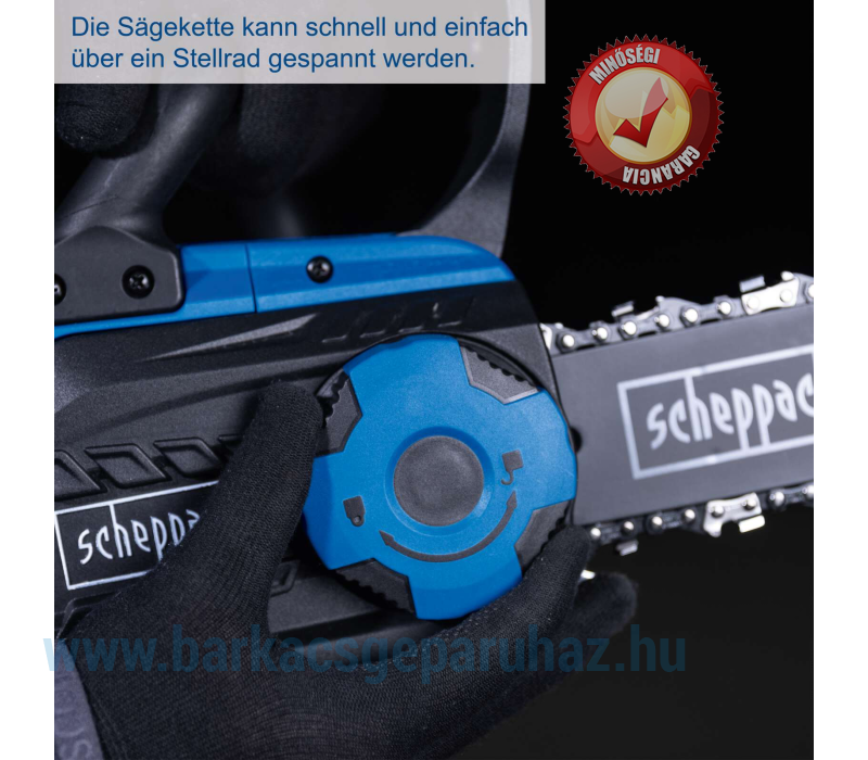 - Vezeték nélküli működés a Scheppach IXES 20 voltos sorozatával – a rendszercsalád összes akkumulátora és töltője kombinálható az akkus láncfűrészhez.