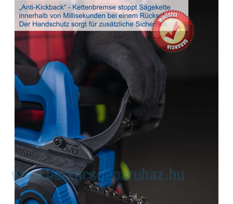 - Visszarúgásgátló – a láncfék ezredmásodpercek alatt leállítja a láncot visszarúgás esetén