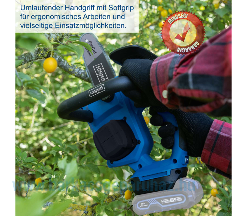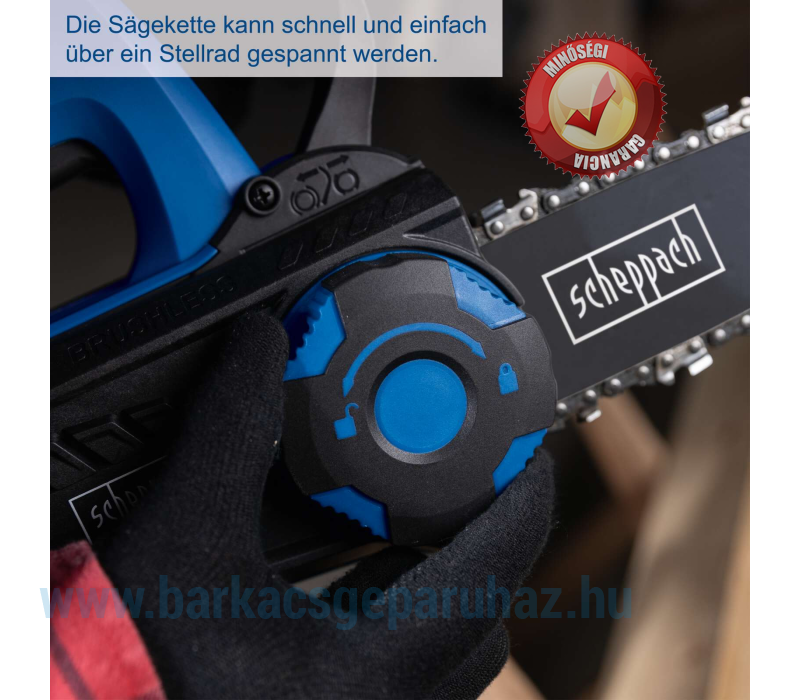 - Vezeték nélküli működés a Scheppach IXES 20 voltos sorozatával – a rendszercsalád összes akkumulátora és töltője kombinálható az akkus láncfűrészhez.