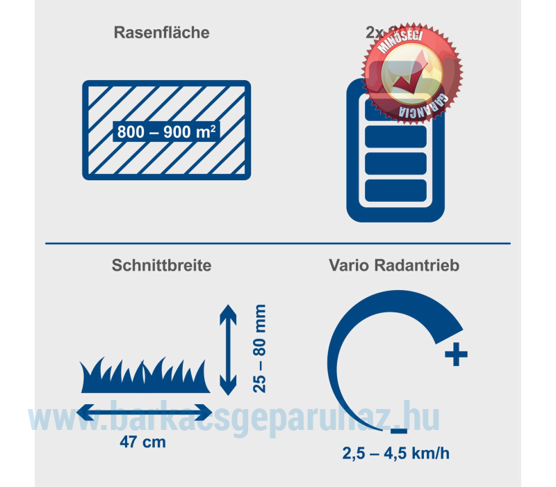 - Vario hajtás – hátsókerék-hajtás 2,5 és 4,5 km/h között változtatható sebességszabályozással, ami megkönnyíti a fűnyírást egyenetlen terepen is