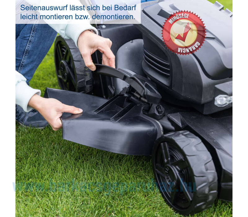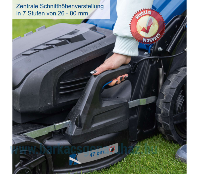 - Erős akkumulátoros fűnyíró 47 cm vágásszélességgel 800–900 m2-es kertekhez