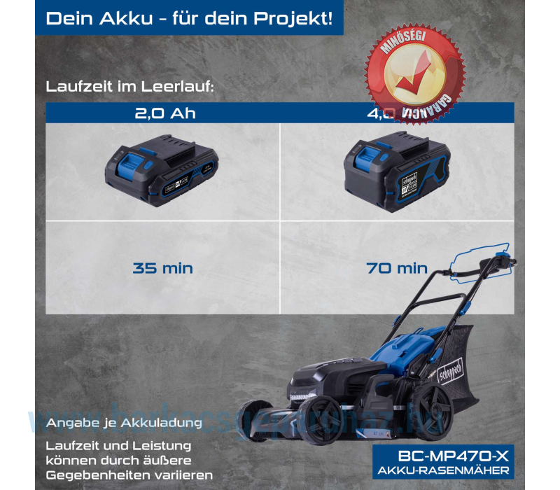 A Scheppach BC-MP470-X akkus fűnyíró 47 cm vágási szélességével megbízható segítőtárs a 800-900 m² -es nagyobb kertekbe . A központi vágási magasságállítás optimális fűnyírási eredményeket biztosít. A BC-MP470-X készüléket egy nagy teljesítményű, kefe nélküli motor hajtja. Ez a szénkefe nélküli motor különösen magas hatásfokot, hosszabb üzemidőt, hosszú élettartamot és kisebb kopást biztosít. A Scheppach IXES 20 voltos sorozatának részeként a rendszersorozat összes akkumulátora és töltője kombinálható a fűnyíróval. A BC-MP470-X mulcsozóbetéttel együtt kerül szállításra.