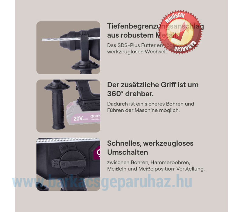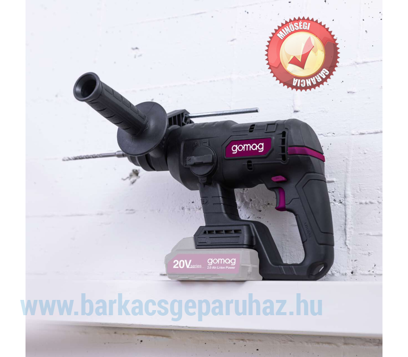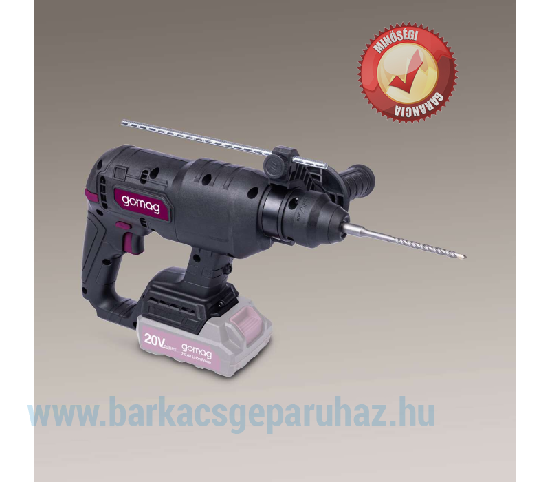 A gomag GO-BOH230BL akkus ütvefúró egy erőteljes, mindentudó eszköz: praktikus 4 az 1-ben funkciójával ideális kő, beton, csempe vagy tégla megmunkálásához. A kívánt funkció gyorsan és szerszámok nélkül kiválasztható egy központi választókapcsolóval: fúrás ütés nélkül, kalapácsfúrás aktivált ütőmechanizmussal, vésés aktivált ütőmechanizmussal és forgásleállítással, valamint folyamatosan változtatható vésőbeállítás. Az erőteljes és tartós kefe nélküli motor különösen magas hatásfokot, hosszabb üzemidőt és csökkentett kopást biztosít. Szabványosított akkumulátorrendszer a teljes gomag termékcsaládhoz – a gomag 20 V-os sorozat összes akkumulátora és töltője kompatibilis a GO-BOH230BL-lel. Az akkumulátor és a töltő külön kapható. Erőteljes akkus ütvefúró 4 az 1-ben funkcióval: fúrás, ütvefúrás, vésés és vésőpozíció-állítás