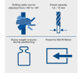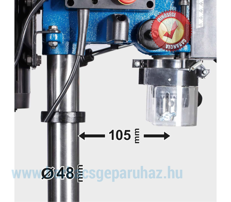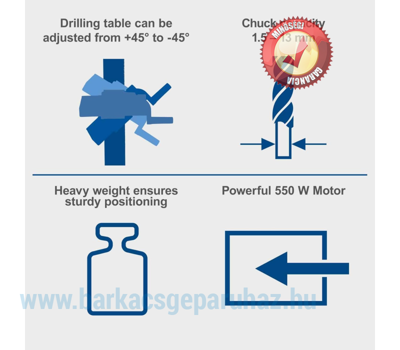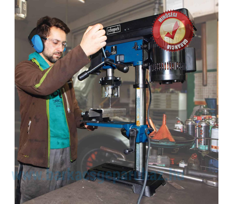 ✔ Sokoldalú fúrási kapacitás: A kulcsos tokmány 1,5–13 mm-es fúrófejekhez illeszkedik, 50 mm-es lökettel és akár 410 mm-es magassággal a tokmánytól az alapig nagyobb munkadarabok esetén