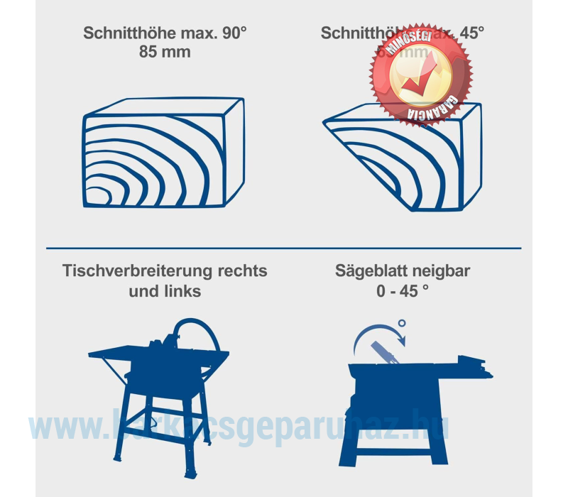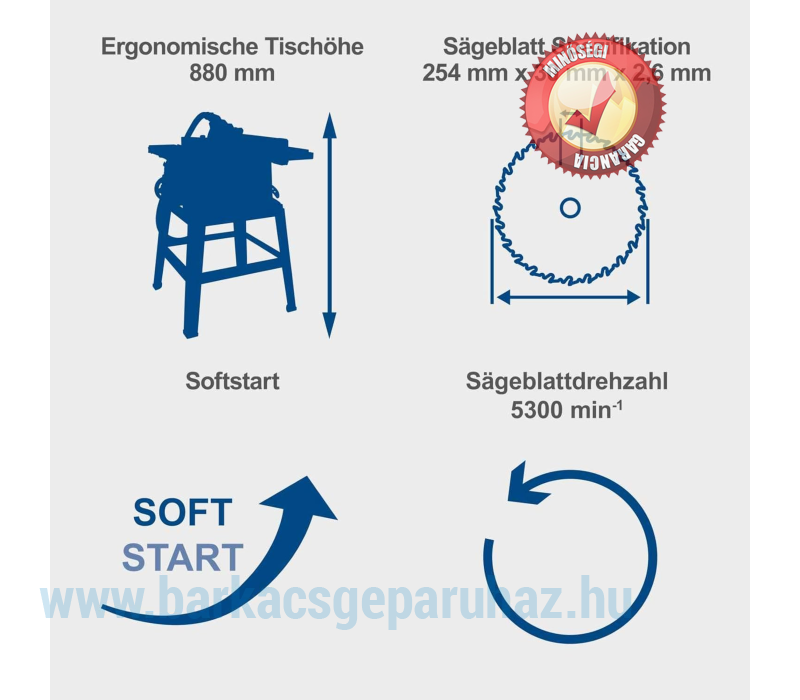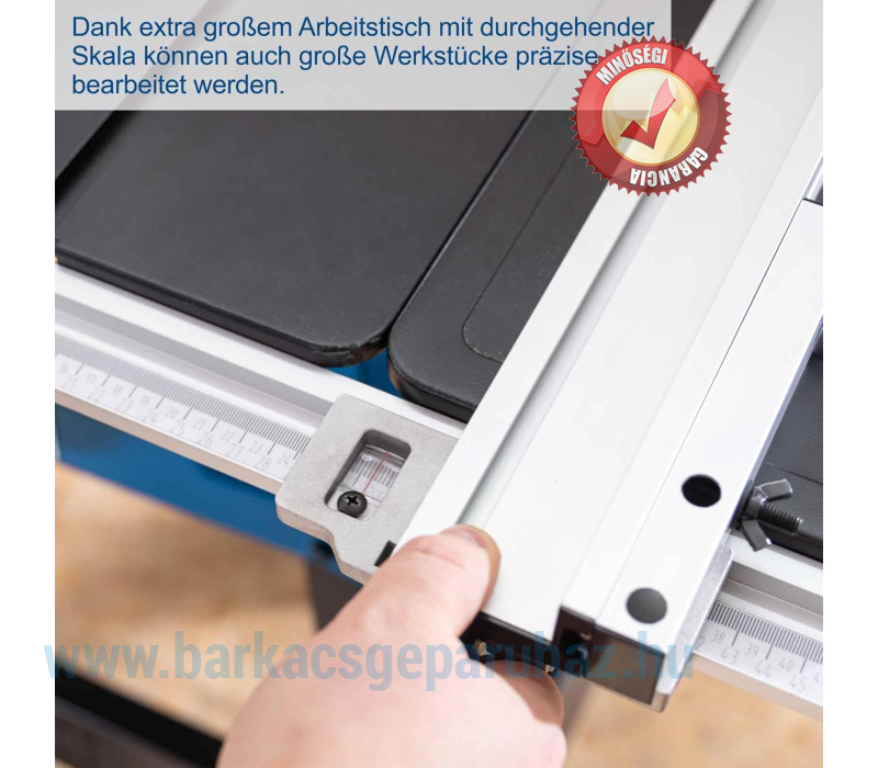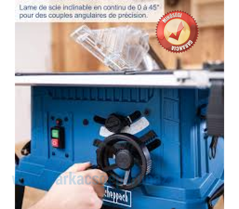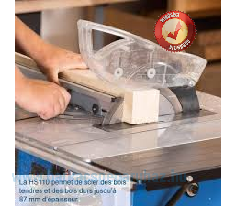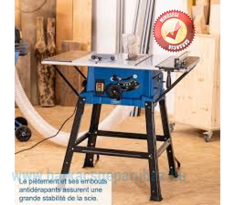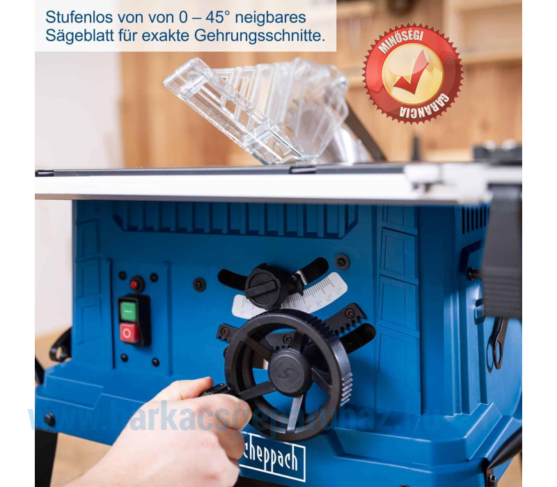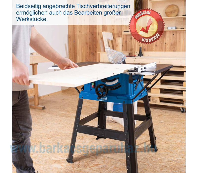 A Scheppach HS 254 modern és nagy teljesítményű asztali körfűrész, faanyagok pontos vágásához. Szerkezete és paraméterei szempontjából a kis asztali körfűrészek kategóriában a csúcstermékei közé tartozik. Tökéletes ergonómiájának alapja a nagyon stabil és magas lábak, ami lehetővé teszi a felegyenesedett pozícióban történő munkavégzést. E mellett, a nagy fűrészlap magasság állító keréknek és a független, akár 45° dőlésszög állításnak köszönhetően, könnyen kezelhető. A megfelelően erős, 2200 W-os motor lehetővé tesz minden általános hosszanti, vagy bonyolultabb vágás, akár puha-, akár keményfában. A 24-es fogazatú keményfémlapkás TCT fűrészlap max. 85 mm-es vágást tesz lehetővé, ami ebben a kategóriában kiválónak számít. A gép standard felszereltsége a beépített mérőskála, a minőségi, nagyon stabil rögzítéssel rendelkező párhuzamvezető, a -60°/+60°-os szögbeállító, a biztonsági burkolat, az elszívó csatlakoztató csonk, tolórúd és egy második, 48-as fogazatú TCT fűrészlap a finomabb vágásokhoz. Nagyon hasznos továbbá, az asztal mindkét oldalra történő szélesítési lehetősége, aminek köszönhetően nagyobb munkadarabok is megmunkálhatók.