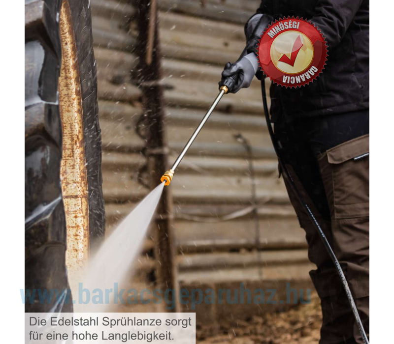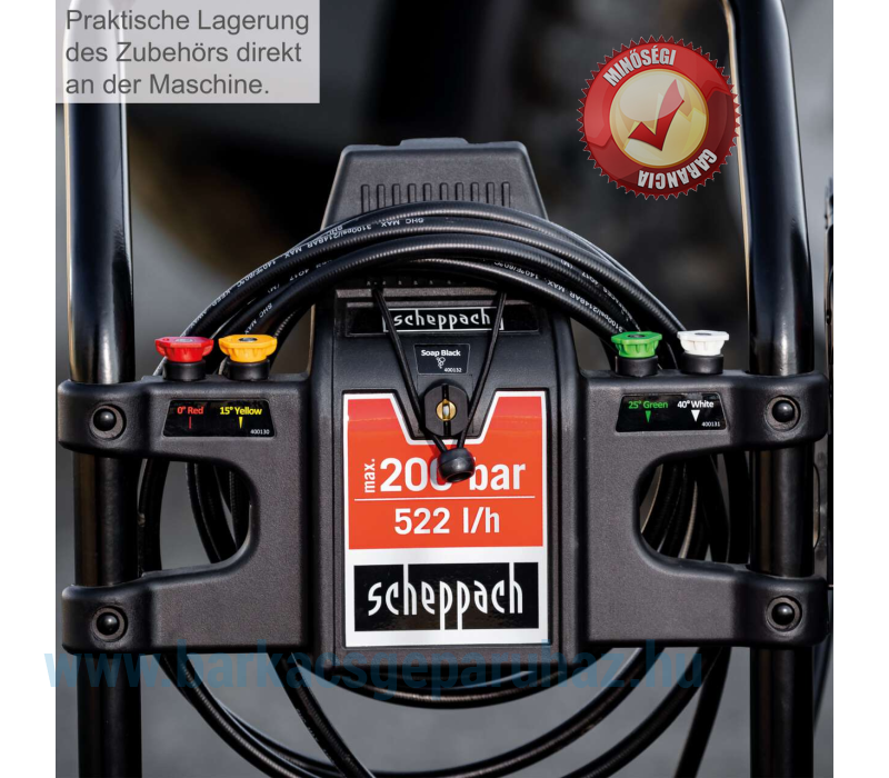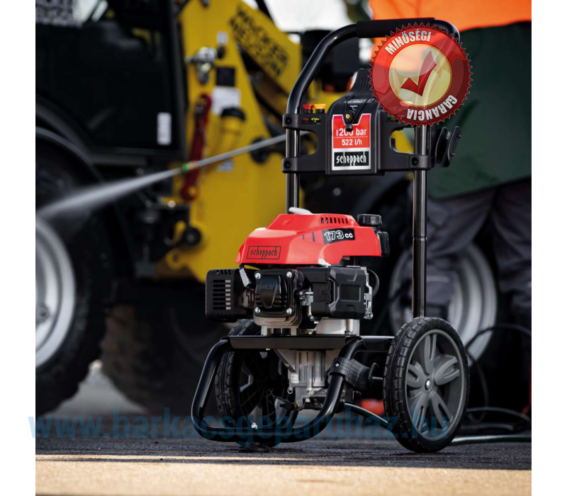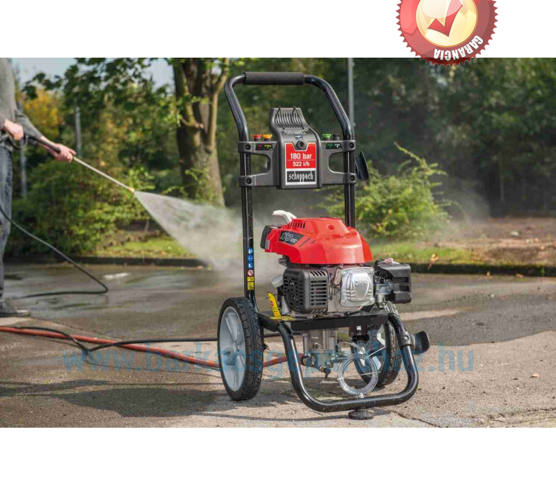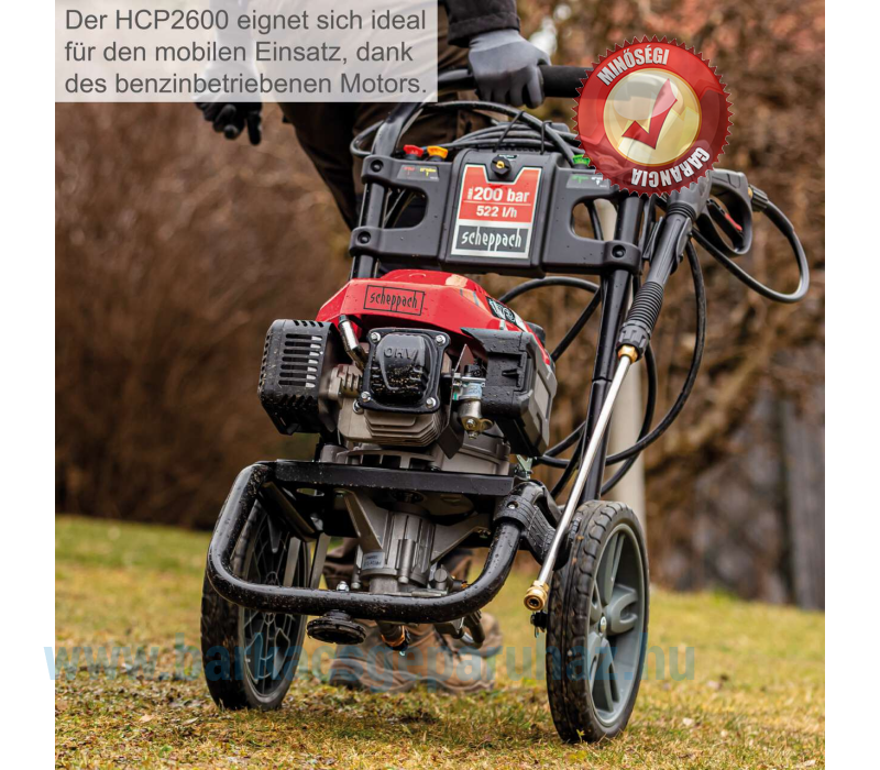 A Scheppach HCP 2600 benzinmotoros magasnyomású mosó egy kiváló teljesítményű, univerzális segítőtárs háztartásokban, mezőgazdasági üzemekben, építkezéseken, szervizekben és minden olyan helyen,ahol igény van a kemény burkolatok, beállók, udvarok, gépek, járművek, hajók vagy más felületek tisztítására. A hosszú életartam alapja az erős, 4,4 LE-s motor, a nagyon stabil felszínkezelt acél keret, a heavy-duty réz szivattyú és pisztoly csatlakozó. A nagy kerekek, a benzinmotornak köszönhető áram ellátástol való függetlenség, a hosszú, 7,5 m-es minőségi magasnyomású tömlő, a pisztoly és az 5 fúvóka könnyű elhelyezhetősége, a mosószertartály, mind a kényelmes munkavégzést szolgálják.A nagyon magas, 522 l/óra vízszállítási sebesség lehetővé teszi még a nagyon komoly szennyeződések eltávolítását is, akár a nehéz körülmények között dolgozó mezőgazdasági gépekről vagy terepjárókról, ill. kiváló öblítése lehetővé teszi nagyobb területek, felületek mosásását is.Jellemzők: