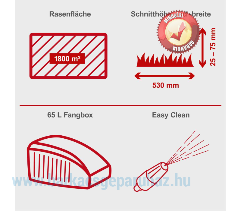 - Robusztus 65 literes fűgyűjtő töltésszintjelzővel