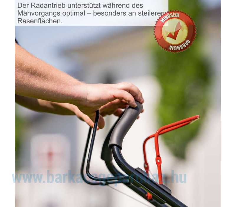 A kényelmes fogantyúnak, a nagy, golyóscsapágyas kerekeknek és a kapcsolható kerékhajtásnak köszönhetően még a dombos kertben vagy a füves lejtőn is könnyedén nyírható. Valóban időt takaríthat meg az XXL 53 cm-es vágásszélességgel, amely lehetővé teszi a hatékony fűnyírást rövidebb idő alatt.
