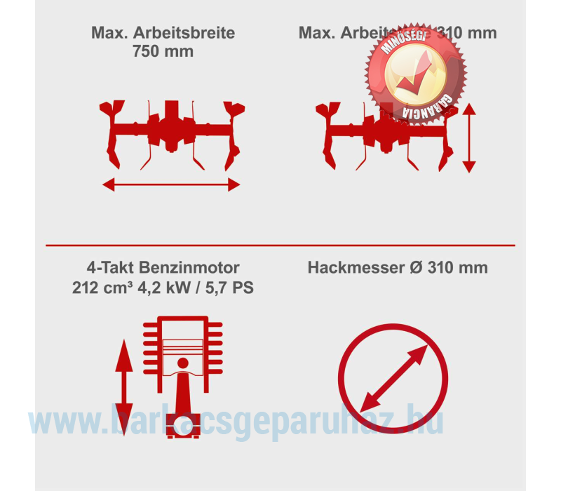 - Erőteljes, 4,2 kW / 5,7 LE teljesítményű négyütemű benzinmotor 212 cm3-rel