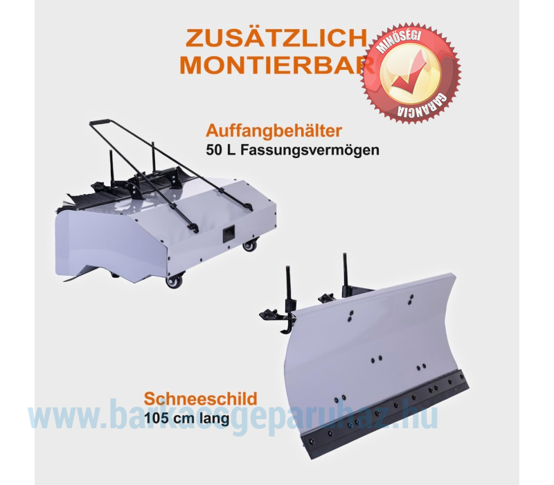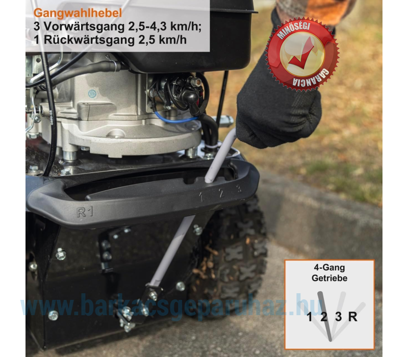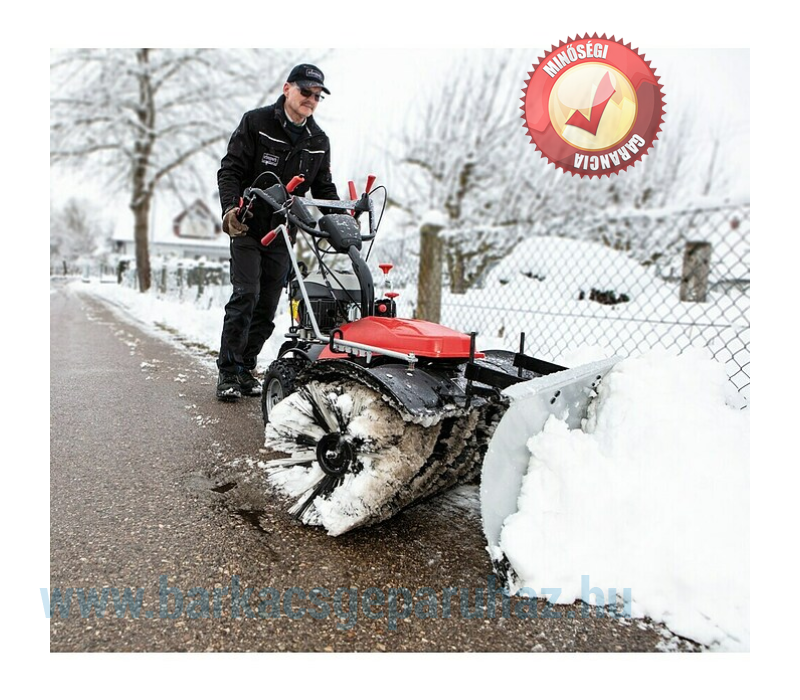 3 előremeneti és 1 hátrameneti fokozat. Állítható szögű és magasságú seprőkefével