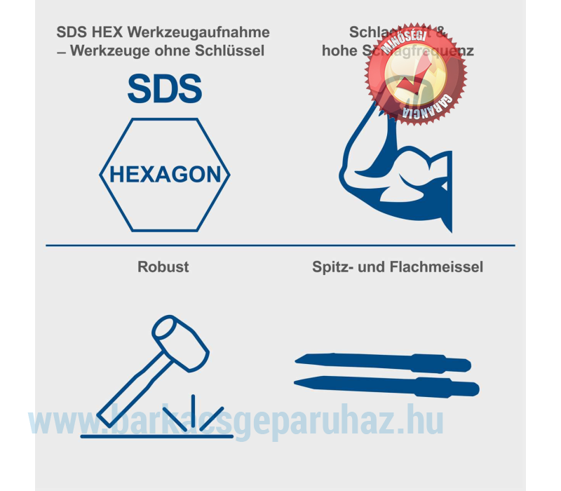 A bontókalapács használat utáni szállításához és megfelelő tárolásához fémtok tartozik hozzá.