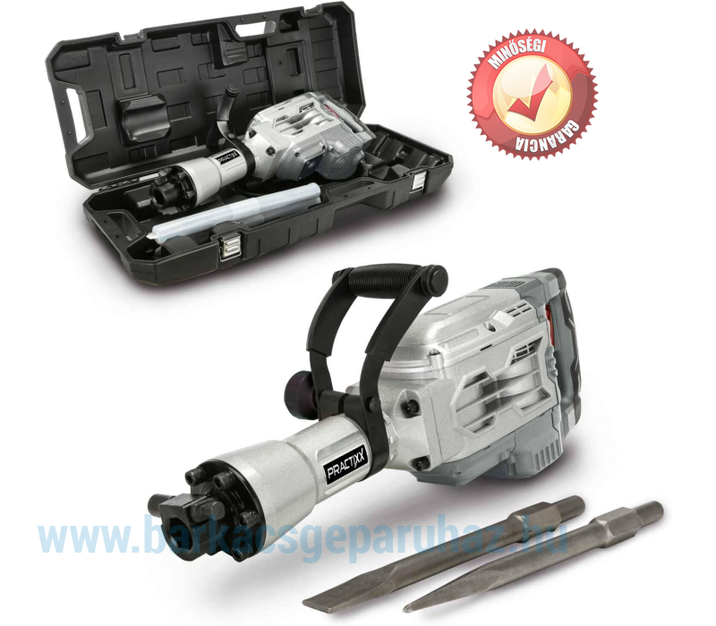 Csempe, fal vagy betonalap eltávolítása – nincs probléma a Practicxx PX-AB-55 bontó kalapáccsal. Még a legkeményebb beton sem éri el az 1700 wattos motorteljesítményt, az 55 joule-os egyedi ütőszilárdságot és a percenkénti 1900 ütési sebességet. A vezetékes bontó- és tömítőkalapács nagy teljesítményű eszköz a talajszintű bontási munkákhoz A 410 mm-es hegyes vésővel vagy a 410 mm-es laposvésővel felszerelve, mindkettő a szállítási terjedelem részét képezi, a falbontás, a padlólapok eltávolítása vagy az alapok, kövek, betontömbök aprítása gyerekjáték minden kézműves számára, legyen szó otthonról. vagy az építkezésen. Amikor bontási munkáról van szó, a bontókalapács hasznos eszköz a munka megkönnyítésére. A kalapáccsal és vésővel végzett kézi munka helyett a bontókalapács vésője belefúr az eltávolítandó anyagba és felaprítja azt. Ez azt jelenti, hogy sokkal kevesebb izomerőre van szükség a bontási munkákhoz, és a munka gyorsabban és hatékonyabban történik. A gép nagy tömege támogatja ezt a folyamatot, mivel nagyobb nyomás képződhet. A 14,2 kg-os nettó tömeg biztosítja, hogy a PX-AB-55 gyakorlatilag beledolgozza magát a talajba. A PX-AB-55 30 mm-es hatlapú szerszámtartóval rendelkezik. A szerszámcsere gyors és egyszerű, további szerszámok nélkül, gyorskioldó segítségével. A két puha markolatú fogantyúnak köszönhetően mindig jól fogható a bontókalapács, még hosszabb munkavégzés esetén is. Az elülső fogantyú rögzítőcsavarral egyedi igények szerint állítható. A hátsó D-fogantyú ergonomikus kéztartást is biztosít. A bontókalapács munkavégzés utáni szállításához és szakszerű tárolásához egy kerekekkel ellátott műanyag tok tartozik a szállítási terjedelembe.