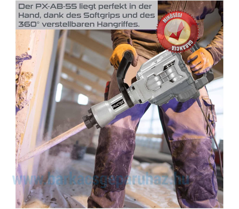 1700 watt teljesítményével, 55 joule ütőerejével és percenként 1900 ütési sebességével a Practixx PX-AB-55 bontókalapács igazi erőmű, amely könnyedén átmegy a falakon és a betonon. A két puha fogantyúnak köszönhetően a készülék biztonságosan ül a kezedben munka közben. A PX-AB-55 hegyes és lapos vésővel, valamint kerekekkel ellátott tokkal érkezik.