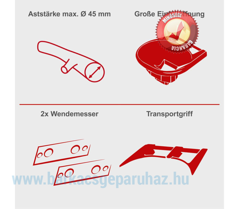 A nagy teljesítményű csiga könnyen szállítja a nyesedéket az aprítógép belsejébe, ahol a szabadalmaztatott átlós vágási rendszer professzionális aprítást végez. Az edzett szerszámacélból készült, strapabíró, megfordítható pengék ügyes vágási eredményt biztosítanak, az ellenkés pedig a legjobb vágási teljesítményt ebben a kerti aprítógépben.