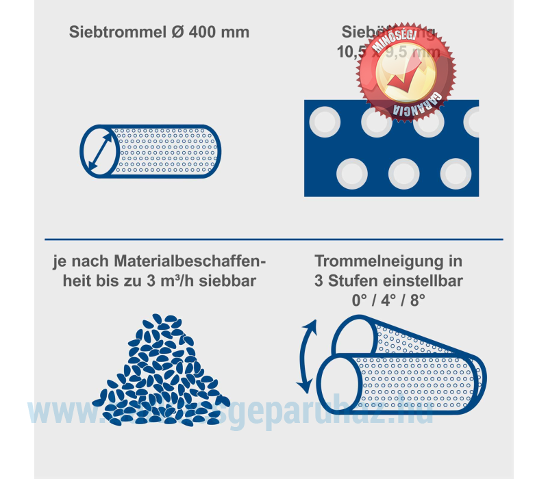 - 400 mm átmérőjű, 775 mm hosszú és 42 perc-1 fordulatszámú szitadob