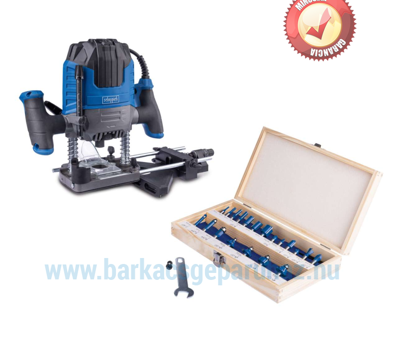 Felsőmaró Scheppach WRT1200 20 darabos vágókészlettel | 11 000-30 000 ford./perc | 1200W | 55mm marási mélység | 2x befogópatron 6/8mm | Porelszívás | változtatható mélységütköző | beleértve a párhuzamos ütközőt