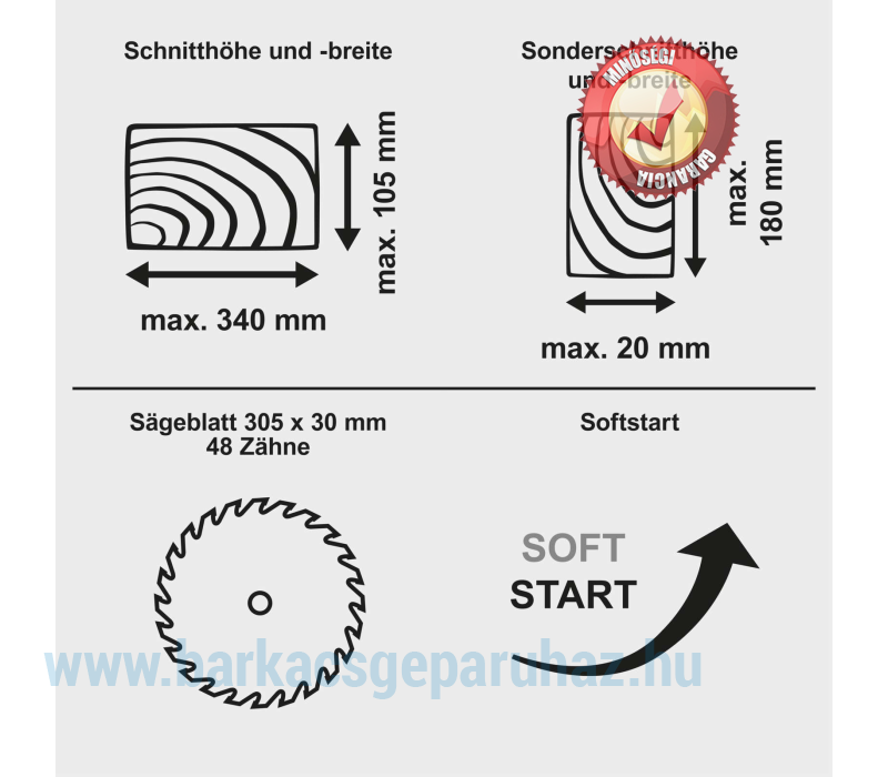 - Nagy vágási kapacitás, 340 mm szélesség és 105 mm magasság