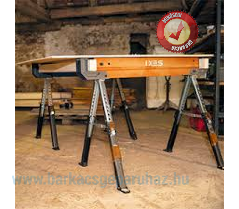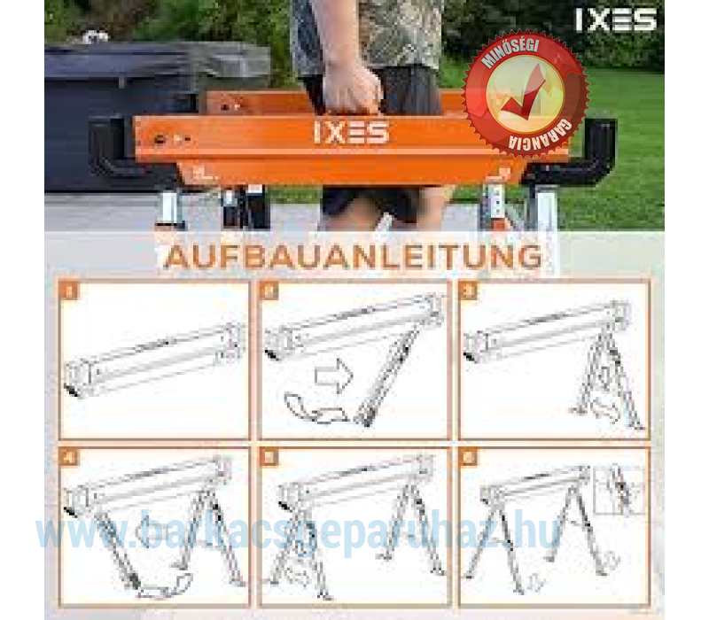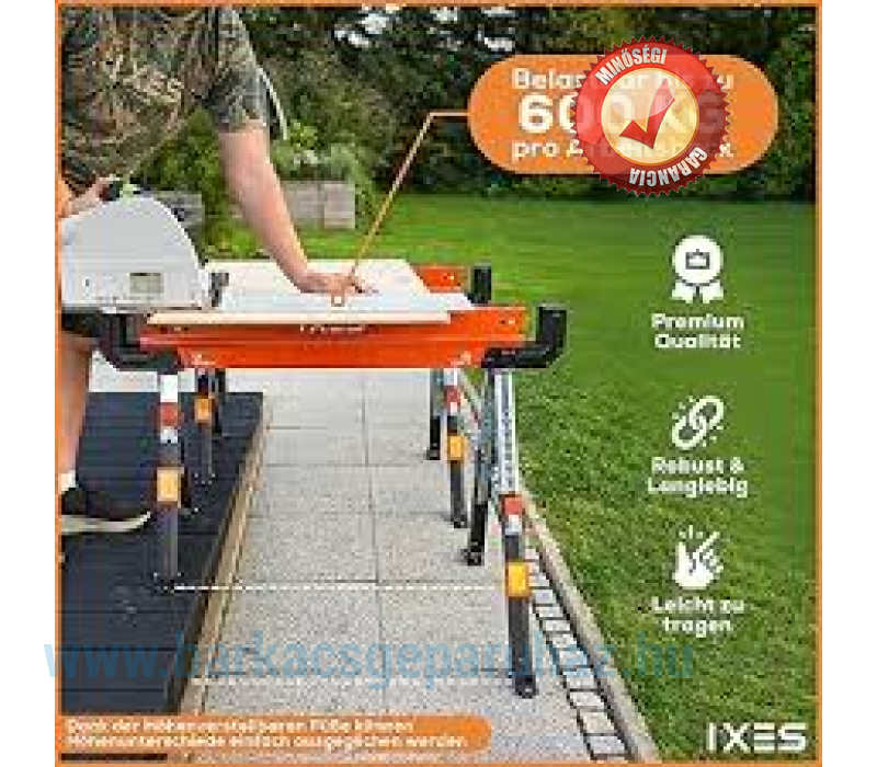 készült , és gyors nyitó- és zárómechanizmussal rendelkezik a könnyű beállítás érdekében. Két pár kiszélesedő lábak további támasztékokkal és csúszásmentes lábakkal biztosítják a biztonságos állványt, még akkor is, ha a használat helyén, például az építkezésen vagy a kertben nem teljesen sík, ez az egyedileg állítható lábakkal kompenzálható. Ez azt jelenti, hogy a munkaállványok egyenetlen talajon is használhatók. Az IX-UTS-600 teherbírása 589 kg . Két IX-UTS-600 munkaállvány használatával a teherbírás megduplázódik, 1178 kg-ra. Amilyen gyorsan felállítható a fűrészló, olyan gyorsan össze is hajtható. Összecsukott lábakkal 1088 x 100 x 145 mm méretű. Ez azt jelenti, hogy az IX-UTS-600 helytakarékosan tárolható és könnyen szállítható. Praktikus hordozó fogantyúval is rendelkezik, amellyel kiegyensúlyozottan hordozható a kb.