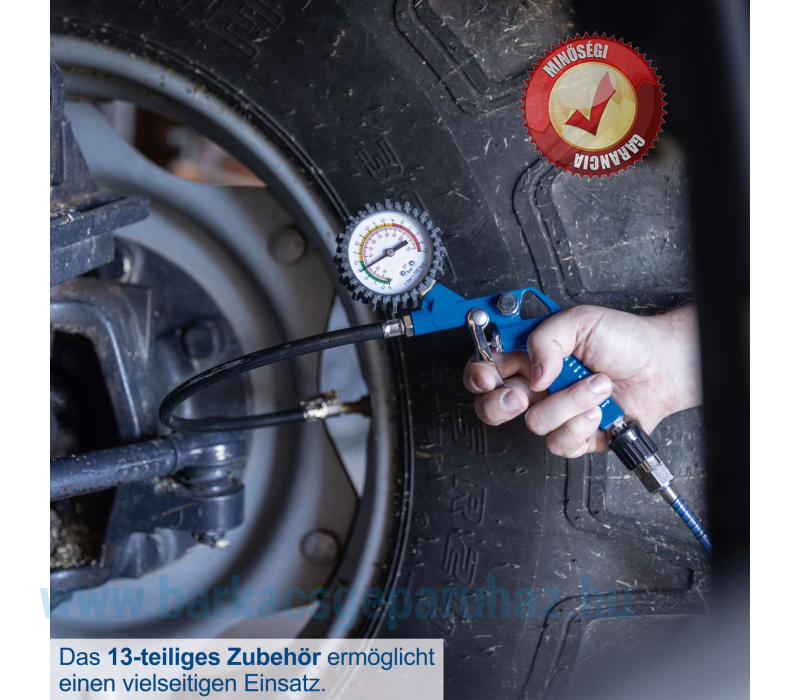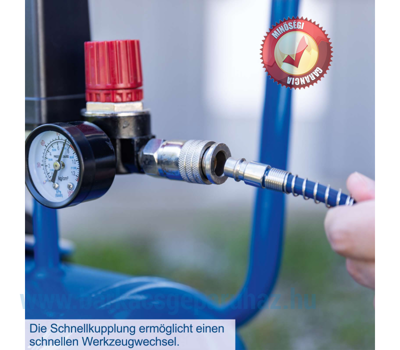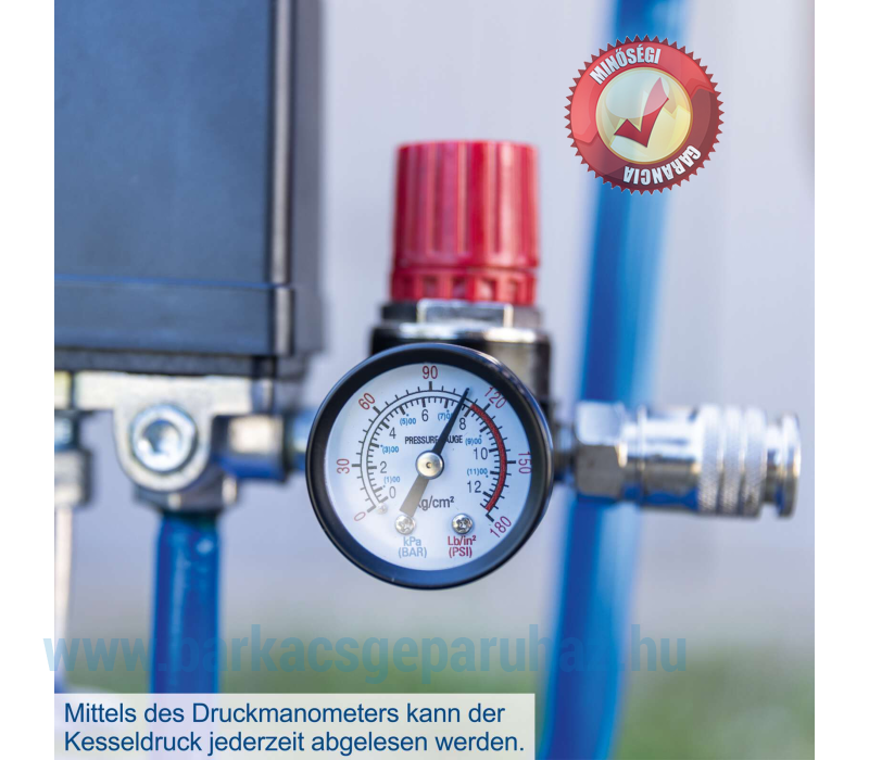 A kompresszor maximum 8 bar nyomáson működik, ami otthoni használatra tökéletesen megfelelő. A tartályban lévő nyomás a beépített nyomásmérővel ellenőrizhető. Ha állandó, alacsonyabb nyomásra van szükség, ez könnyen beállítható a nyomásmérőn található beépített nyomásszabályozóval.