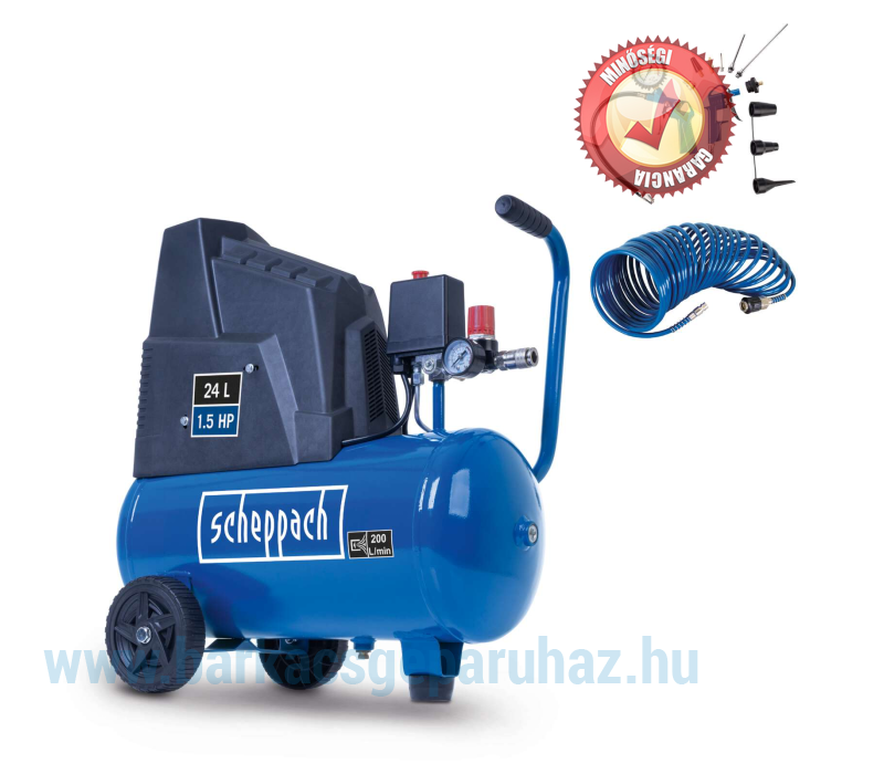 1100 wattos motorjával, 24 literes tartályával és 200 l/perc maximális szívókapacitásával a Scheppach HC30o kompresszora ideális kisebb pneumatikus szerszámok, például szegezőpisztolyok, gumiabroncs-felfújók és tisztítópisztolyok használatához.