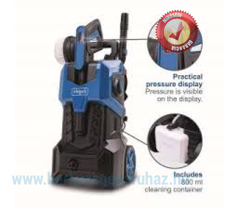 Felszereltség: 8 m magasnyomású tömlő, 0,8 l-es beépített mosószer tartály, szórópisztoly szórófejjel és hosszabbító szárral, turbó fúvóka, rotációs kör mosókefe, nyomás kijelző