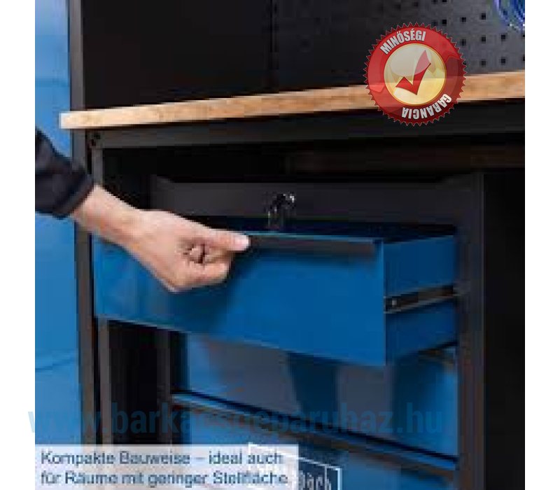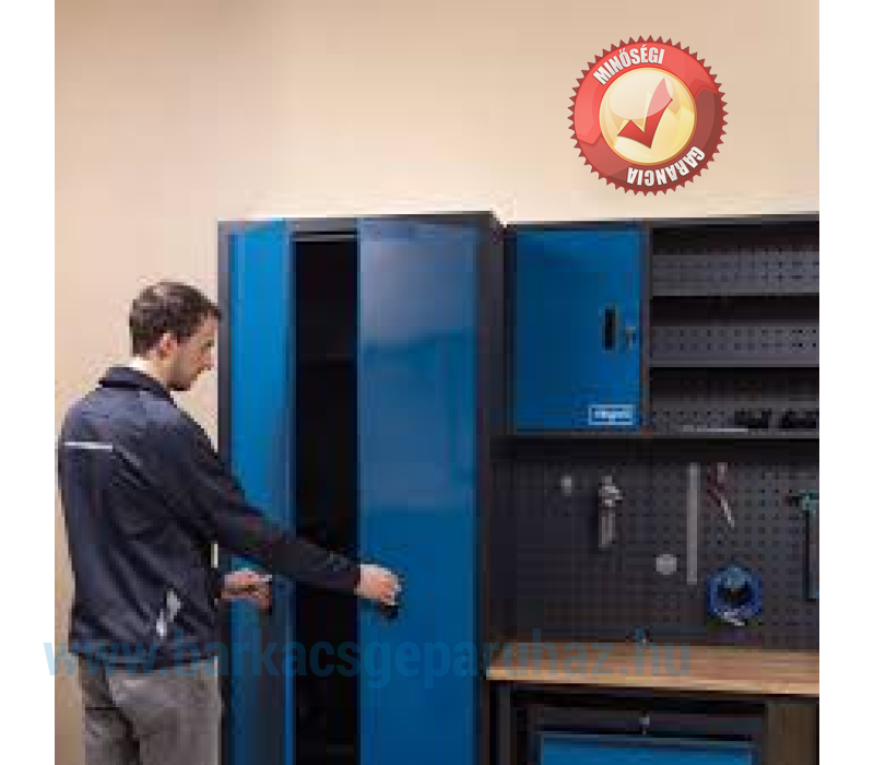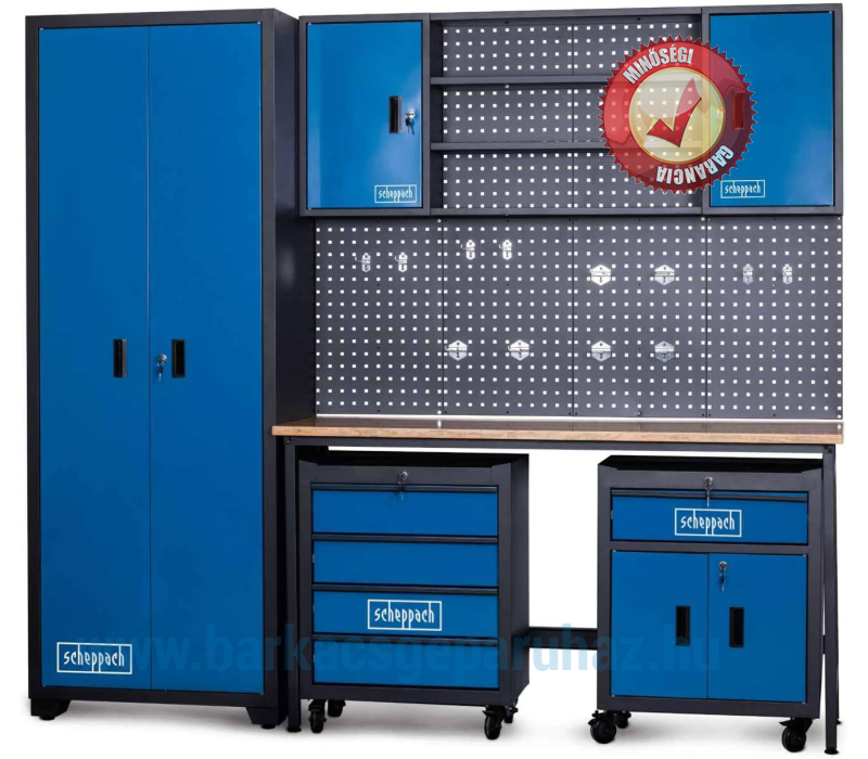 A Scheppach GWS 08 moduláris műhelyrendszer ideális megoldás minden műhely számára, még szűk hely esetén is. Olyan alapvető felszereléseket tartalmaz, amelyek segítenek hatékonyan megszervezni a munkakörnyezetet, és minden szükséges kéznél legyen. A készlet egy szekrényt, egy akasztós szekrényt, egy munkaasztalt, két mobil műhelykocsit, egy perforált falat és tizenkét kampót tartalmaz, hogy műhelye tökéletesen szervezett legyen. Minden elem robusztus, porfestett acéllemezből készül, így tartós és hosszú élettartamú. A szekrények zárhatóak, ami lehetővé teszi a munkaeszközök és eszközök biztonságos tárolását. A különálló szekrény szárnyas ajtókkal, egyenként 30 kg teherbírású állítható polcokkal és állítható magasságú lábakkal van felszerelve a jobb stabilitás érdekében még egyenetlen padlón is. Az akasztós szekrény mindkét oldalán zárható ajtókkal és nyitott középső résszel rendelkezik, három polccal, amelyek összesen 50 kg-ot bírnak el. A hátoldalon 10 x 10 mm szabványos nyílású, 38 mm-es osztású perforált fal található, amely lehetővé teszi a kampók és egyéb tartozékok egyszerű rögzítését. A csomag tizenkét kampót is tartalmaz különböző szerszámokhoz - hat szimpla horog, három dupla horog és három zárt dupla horog. Két műhelykocsi biztosítja a mobilitást és a rugalmasságot a szerszámok rendszerezésében. Az egyik kocsiban négy zárható fiók, míg a másikban egy fiók és két zárható szekrény található. Mindkét kocsinak négy kereke van, amelyek közül kettő fékezhető. Az fiókok teherbírása egyenként 10 kg. Az 1600 x 500 mm-es fix munkalappal ellátott munkapad nagy munkafelületet biztosít. Az állítható magasságú lábak stabilitást biztosítanak bármilyen felületen. A rendszert egy perforált fal teszi teljessé, 10 x 10 mm-es szabványos furatokkal és 38 mm-es osztásközzel, amely lehetővé teszi a szerszámok és tartozékok változó elrendezését. Ez a moduláris műhelyrendszer ötvözi a funkcionalitást, a minőséget és a rugalmasságot, ezért ideális megoldás mindazok számára, akik szervezetten és hatékonyan szeretnék dolgozni a műhelyben.