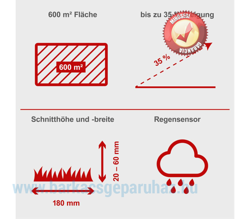 • Ideális akár 600 m² gyepfelületű kertekhez