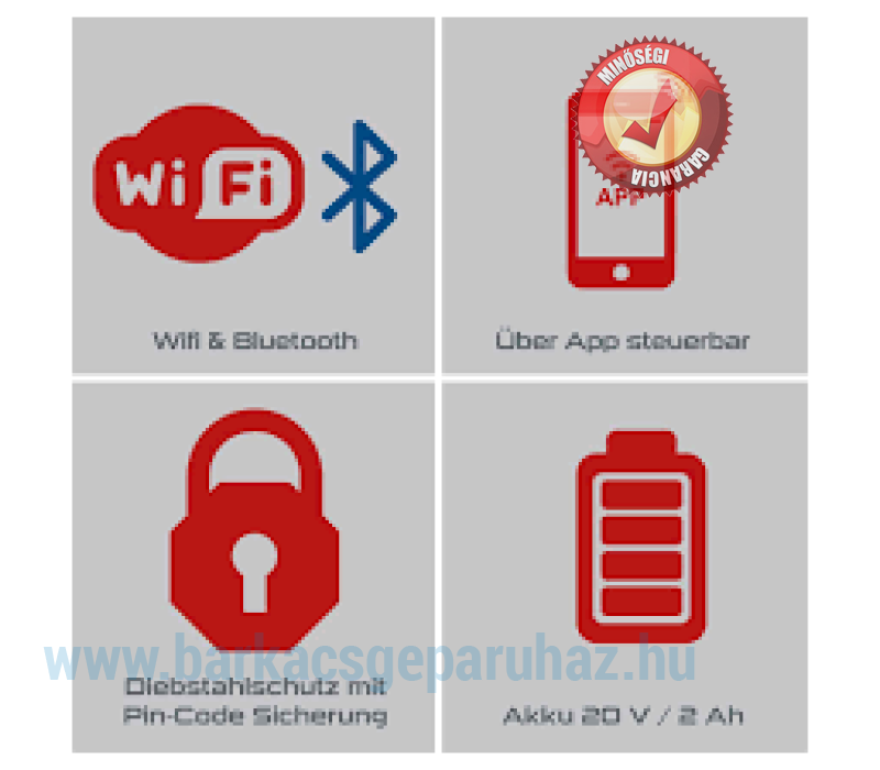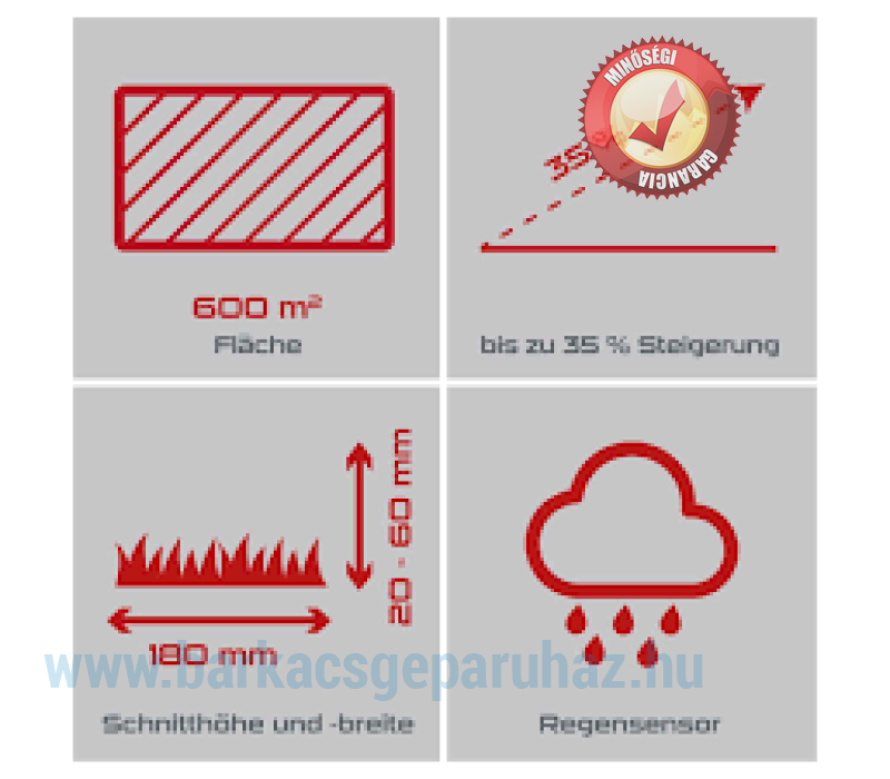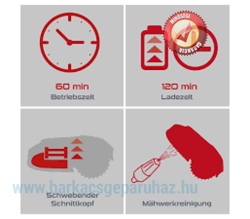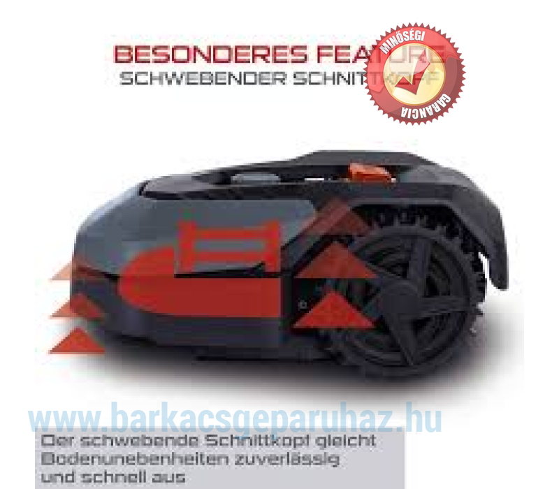 - Szállítási terjedelem: robotfűnyíró, gyorstöltő állomás, 130 m-es határolókábel, 180 földelőhorgony, 3 előre összeszerelt kés és 6 cserepenge