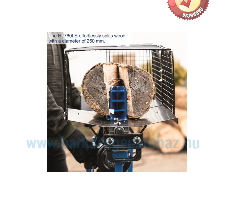 A HL760L rönkhasító védőrácstal van felszerelve, amely megakadályozza a fa szilánkokra szakadását. A kétkezes kezelés további biztonságot nyújt: a bal kéz a vezérlőkart, a jobb kéz a kioldógombot működteti. Bármelyik vezérlő elengedése azonnal leállítja a gépet. Mindkét vezérlő elengedése visszahúzza a nyomólapot.