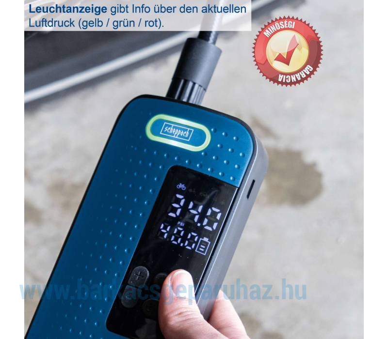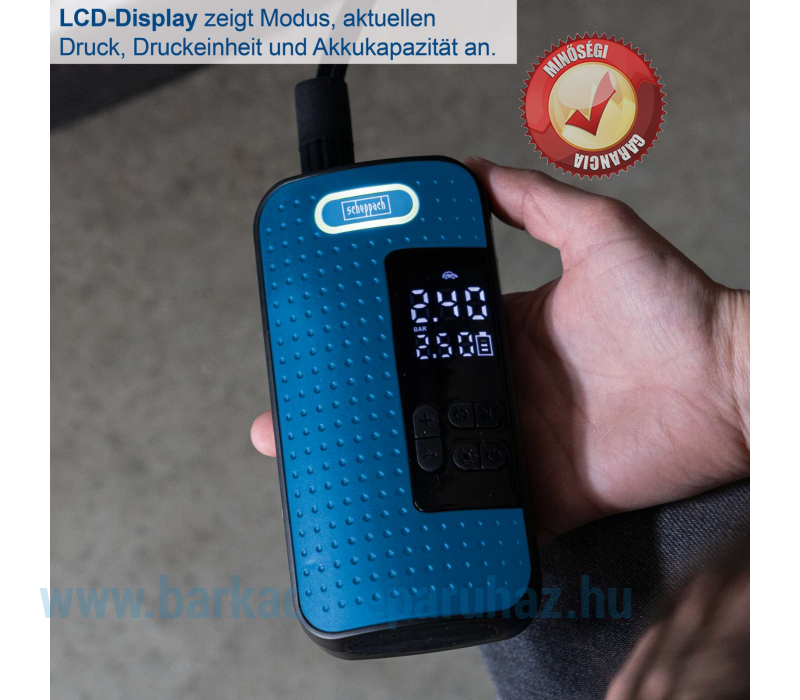 A Scheppach AC10/8V akkus kézi kompresszor, maximálisan 10,3 bar üzemi nyomással, egy praktikus, hatékony eszköz útközben, ideális autó- vagy kerékpárabroncsok, labdák és légmatracok felfújásához. A kompakt kompresszor öt üzemmóddal rendelkezik: kerékpár üzemmód, motorkerékpár üzemmód, autó üzemmód, labda üzemmód és kézi üzemmód. Az LCD kijelző mutatja a kiválasztott üzemmódot, az aktuális nyomást, a nyomás mértékegységét és az akkumulátor kapacitását. Egy további jelzőfény (sárga/zöld/piros) is tájékoztatást nyújt az aktuálisan mért légnyomásról.