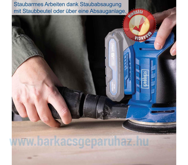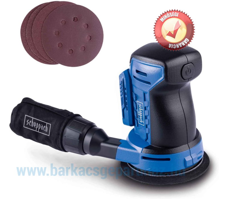 Scheppach akkus excentercsiszoló C-OBS125-X 20V-os csiszológép lágyindítással | Csiszolókorong átmérője 125 mm | Oszcilláló kör 2 mm | Puha markolatú fogantyú és porelszívás | 20 V IXES Akkumlátorral-töltővel!