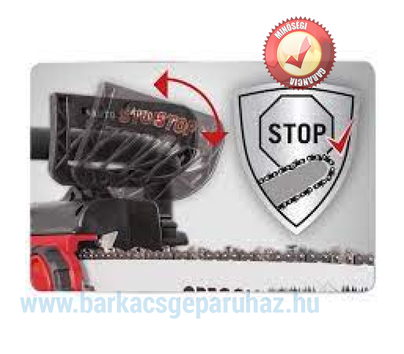 - Kézvédelem integrált rendszerfékkel, amely visszarúgás esetén néhány milliszekundumban leállítja a láncot