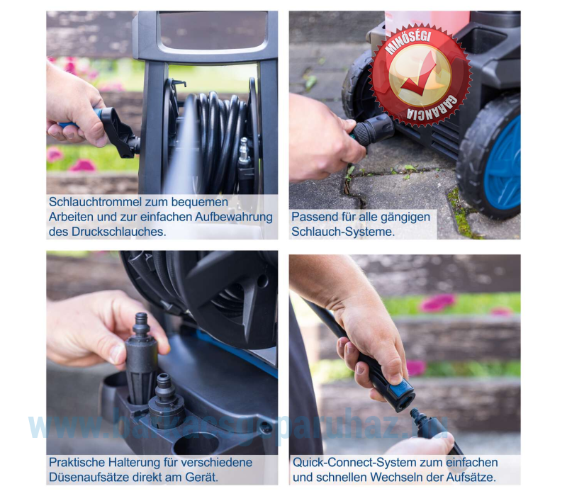 - Beépített tömlődob tömlővezetővel a kényelmes munkavégzéshez és a nyomótömlő egyszerű tárolásához.