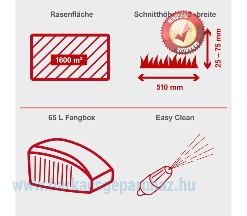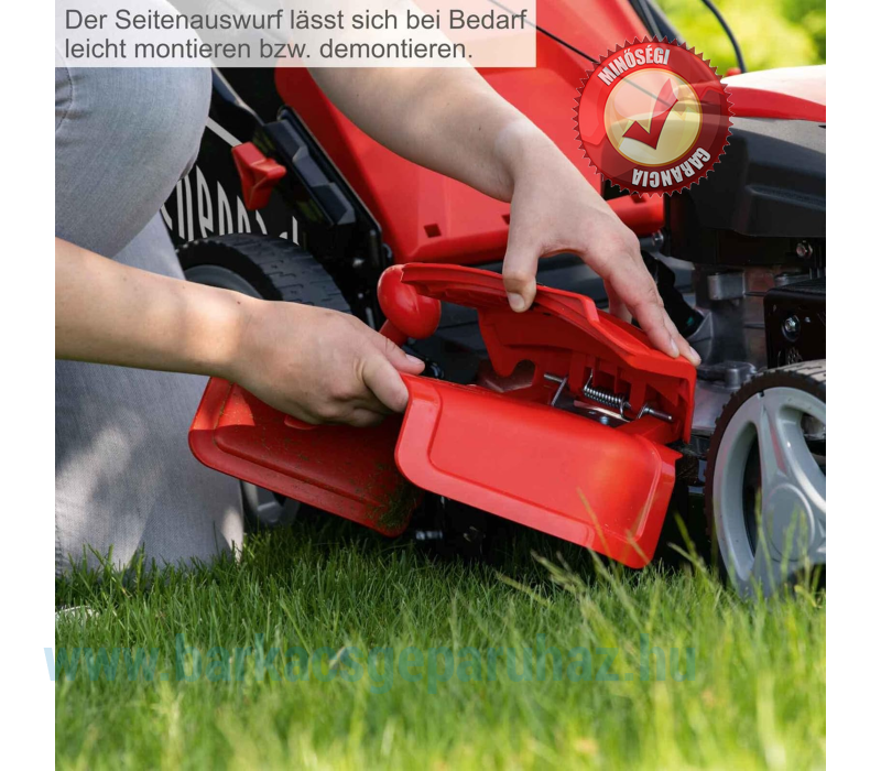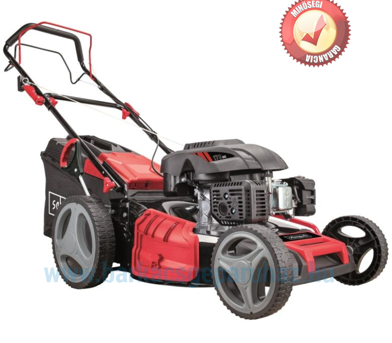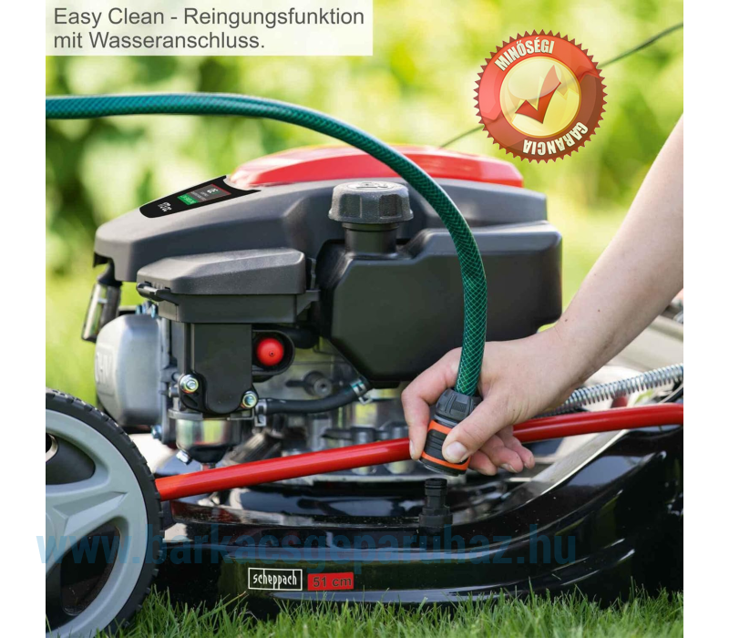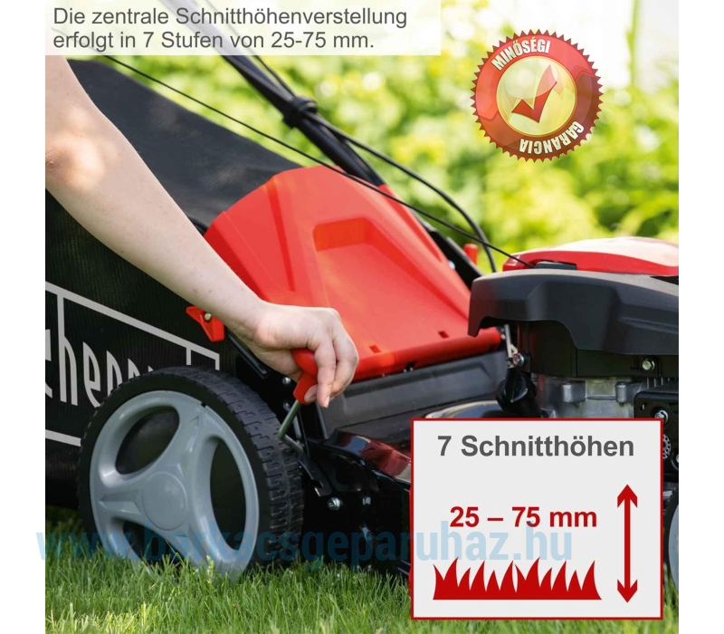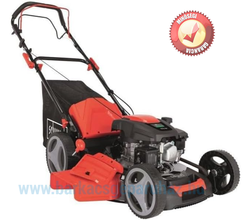 A Scheppach MS 173-51 fűnyíró ideális választás a közepes vagy nagyobb méretű gyepekhez. Kemény munkára és hosszú élettartamra van tervezve. Ezért nem nélkülözi a praktikus és kényelmi megoldásokat sem. Alapja a nagy, 51 cm-es munkaszélesség és az erős 173 cm3-es, ami akár a magas, nedvesebb fűvel vagy erősebb, gazosabb növényzettel is megbirkózik. A füvet többféle módon képes feldolgozni. Vagy hagyományosan összegyűjti a gyűjtőkosárba, vagy, a standard tartozék mulcsozó dugó segítségével, képes mulcsozni, ami biotrágyaként szolgálhat a terepen. E mellett, természetesen oldalra, vagy hátra is ki tudja dobni a levágott füvet. A gép erős acél alvázzal, minőségi, heavy-duty GT Transmission meghajtással, a könnyebb manőverezést elősegítő, nagy kerekekkel, tágas, telítettségjelzős gyűjtőkosárral, központi vágásmagasság állítással, ergonómikus, állítható, puhított markolatú tolószárral és a vágótér könnyű tisztítást lehetővé tevő fúvókaval. A tárolásnál és a szállításnál nagy segítséget jelent az összecsukható tolószár. Az 51 cm-es vágószélesség kb. akár 1500 m2/ óra munkateljesítményt tesz lehetővé.