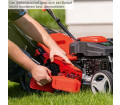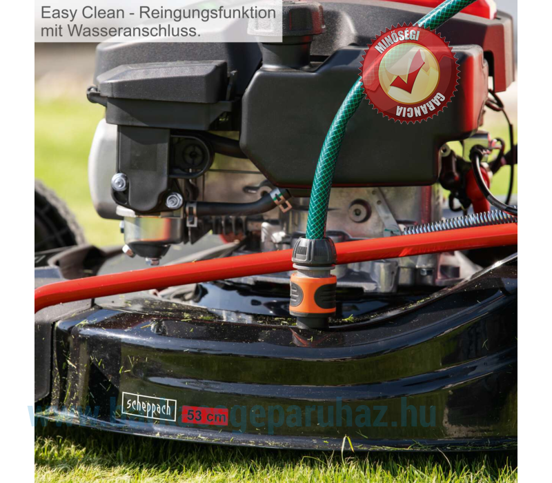 Könnyű fűnyírás az önjáró hajtásnak köszönhetően – a hibátlan, dús zöld gyepért. A Scheppach MS226-53E gyors és egyszerűvé teszi a fűnyírást. Nagy nyomatékának és 53 cm-es vágási szélességének köszönhetően még a magas fű sem jelent problémát az MS226-53E számára. A nagy, golyóscsapágyas kerekek kivételesen sima működést biztosítanak. Egy erős, 224 cm³-es, 6 lóerős (4,4 kW) négyütemű benzinmotor bőséges teljesítményt biztosít. A központi vágási magasság-állító segítségével egy kézzel is kiválasztható a hétféle vágási magasság, 25 és 75 mm között. Az integrált mulcsozó funkció finomra aprítja a levágott füvet, így az természetes, szerves trágyaként a lenyírt területen maradhat. Különösen akkor, ha az erőteljes növekedés gyakori nyírást tesz szükségessé, a mulcsozás szükségtelenné teszi a levágott fű eltávolítását. A robusztus, 65 literes gyűjtőláda bőséges helyet kínál a nyesedéknek. A szövetből készült szerkezet hatékony feltöltést tesz lehetővé, a műanyag fedélnek köszönhetően pedig gyors és egyszerű az ürítés. Egyszerűen vegye le a gyűjtőládát a tartóról, és ürítse ki a komposzthalomra vagy egy zöldhulladék-tartályba. Az MS226-53E nemcsak nagy teljesítményével és kivételesen könnyű kezelhetőségével nyűgöz le fűnyírás közben. Munka után az integrált tisztítófunkció biztosítja a készülék egyszerű és gyors tisztítását. Fűnyírás után az MS226-53E helytakarékosan tárolható és az összecsukható fogantyúnak köszönhetően könnyen szállítható.
