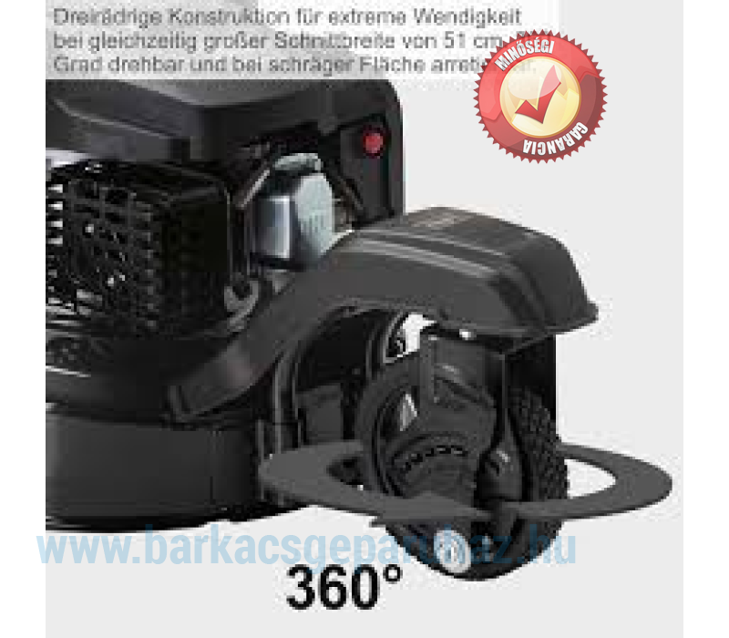 - Háromkerék-konstrukció az extrém manőverezhetőség érdekében, nagy, 51 cm-es vágásszélességgel