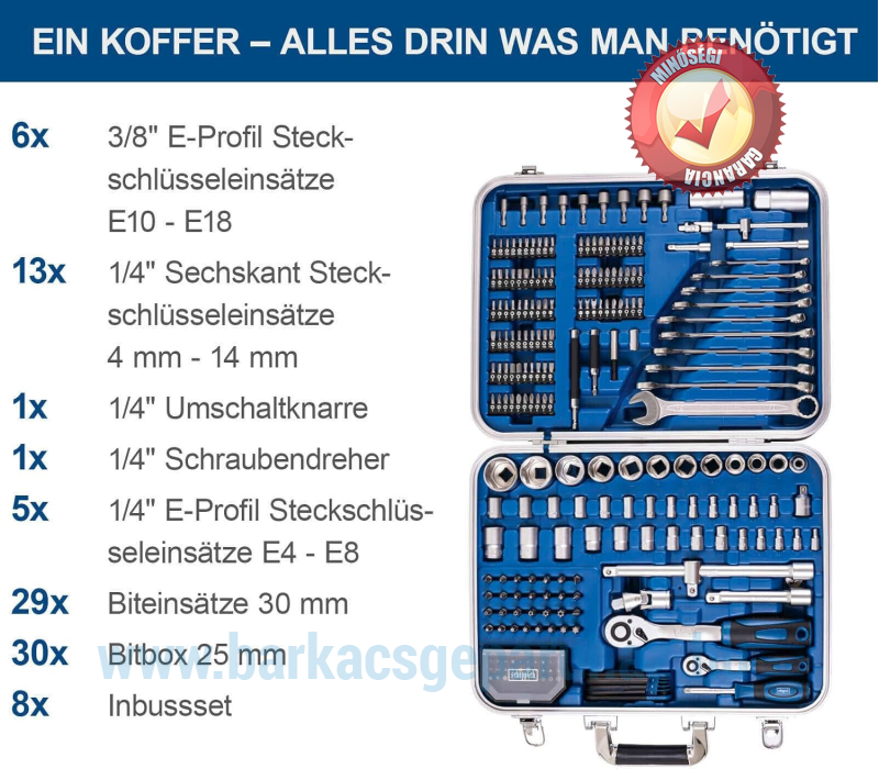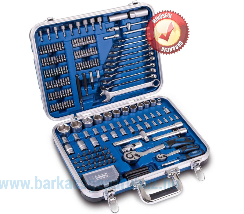• Átfogó tartalom – ideális széleskörű igényekhez és alkalmazásokhoz: o 11 db 1/2"-os imbusz dugókulcs 15 – 32 mm / Univerzális csukló 1/2" / Irányváltós racsni 1/2" / Hosszabbító 5" / Hosszabbító 10" / Csúszó adapter 1/2" / 2 db gyújtógyertya dugókulcs 16 és 21 mm / Dugókulcs adapter 1/2"-ról 1/4"-re / 3 db E-profilú dugókulcs 1/2" E20, E22, E24 / Dugókulcs adapter 1/2"-ról 3/8"-ra / 6 db E-profilú dugókulcs 3/8" E10 – E18 / 13 db 1/4"-os imbusz dugókulcs 4 – 14 mm / Univerzális csukló 1/4" / Irányváltós racsni 1/4" / Hosszabbító 2" / Hosszabbító 4" / Csúszó adapter 1/4" / Csavarhúzó 1/4" / Bittartó 1/4" / 9 db dugókulcs adapter 1/4" 5, 6, 7, 8, 9, 10, 11, 12, 13 / 3 db mágneses bittartó 60 mm, 80 mm, 120 mm / 5 db E-profilú dugókulcs 1/4" E4 – E8 / 90 db bit / 29 db hosszú bit / bitdoboz 30 bittel / 9 db csillagvilláskulcs 8 – 19 mm / 1 db 8 részes imbuszkulcskészlet / hordtáska