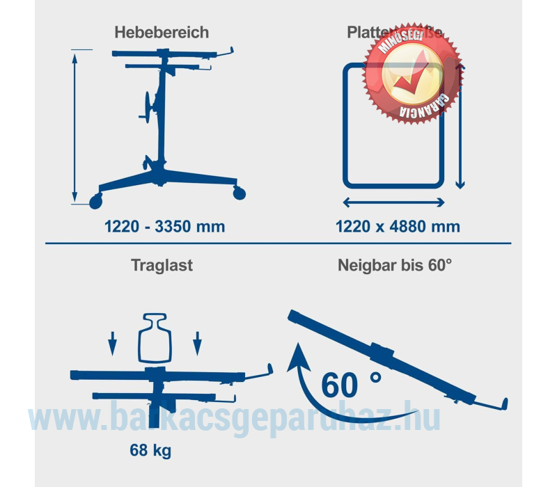 Nagy emelési tartomány 1220-3350 mm | Maximális terhelés: 68 kg