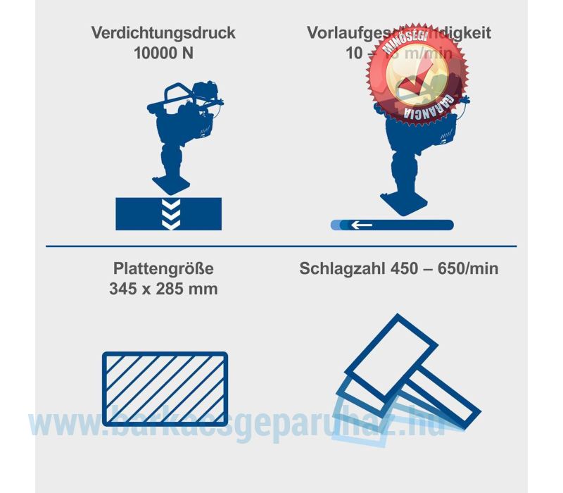 A VS 1000 vibrációs döngölőgép kiváló ár-érték aránnyal rendelkezik, és esetleg érdekelheti Önt, amennyiben építkezik, karbantartási munkákat végez a ház körül, vagy építési munkákkal foglalkozik. A döngölő kiválóan alkalmas a homok, a kavics, az agyagos talaj vagy vegyes talaj, tömörítéséhez olyan helyeken is, ahol más géppel nehezebb dolgozni, úgymint a házfalak mentén, közműépítéseknél, építési munkagödröknél, stb. A gépet nagyon kényelmesen és egyszerűen lehet kezelni a masszív, acélkereten elhelyezett kezelőegységgel. Az acélkeret egyben védi a motort és a sebességváltó érzékeny részeit az esetleges sérülésektől. Az egész gépet rendkívül jól kiegyensúlyozták, ennek köszönhetően nagyon könnyű tartani vele a döngölési irányt munka közben, ami ebben az árkategóriában meghaladja az átlagon felüli értéket. A magas 1000 kg-os ütőerő miatt könnyen alkalmazható bármilyen talajtömörítési feladathoz. A világ egyik legnagyobb motorgyártója által készített motor érzékeny szűrőberendezéssel van ellátva a poros környezetben végzendő munkákhoz, könnyen indítható, csendes, megbízható és gazdaságos az üzemanyag fogyasztása is. A komfortosabb munkavégzéshez a gépkeret hatalmas gumírozott rezgéscsillapítókon van elhelyezve. A görgők a gép tartozékai, amelyek lényegesen megkönnyítik annak mozgatását.