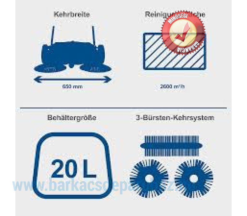 Akár 2600 m2-es területek nagyméretű tisztítása a 650 mm-es seprési szélességnek köszönhetően