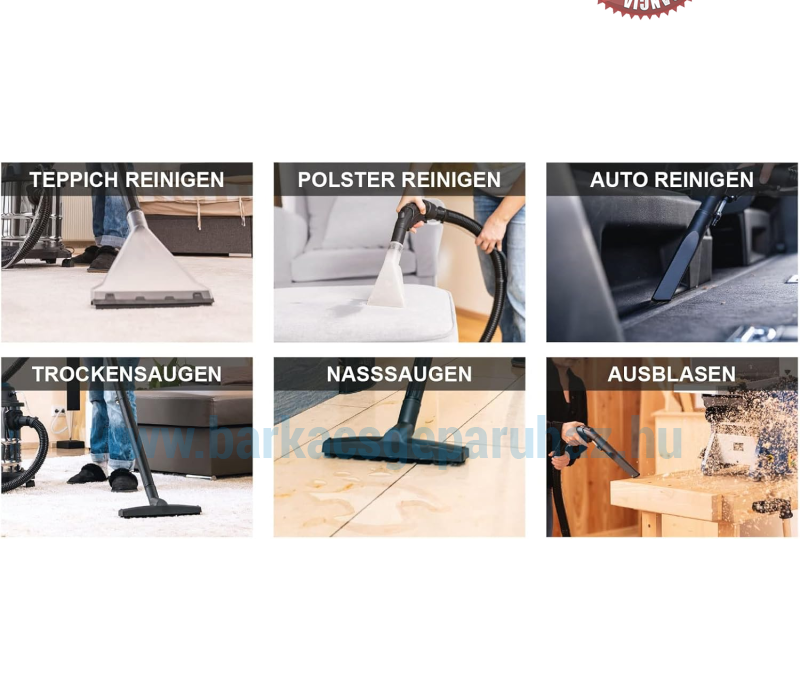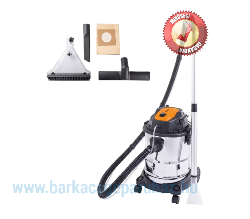 - Tartozékokkal együtt: szívócső, 2 hosszabbító cső, mosófej kemény felületekhez való rögzítéssel, kárpittisztító fúvóka, padlótisztító fúvóka, habszűrő, papírszűrő zsák és kárpittisztító fúvóka