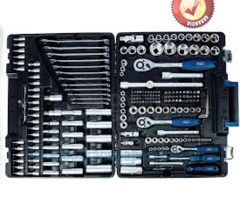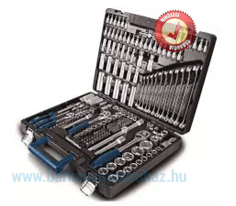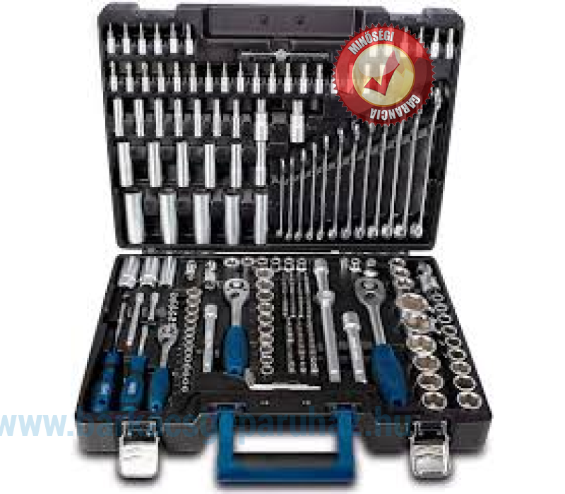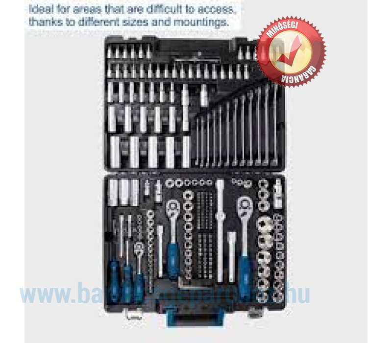 Alsó rekesz: 15 x dugókulcsfej 1/2" 10 x dugókulcsfej 3/8" 14 x dugókulcsfej 1/4" 3 x dugókulcsfej Thorx 1/2" 6 x dugókulcsfej Thorx 3/8" 5 x dugókulcsfej Thorx 1/4" 1 x dugókulcsfej biztosító golyóval 1/2", 5/16"-os bitekhez 1 x dugókulcsfej biztosító golyóval 3/8", 5/16"-os bitekhez 1 x dugókulcsfej biztosító golyóval rugóval 1/4", 1/4"-os bitekhez 2 x gyertya dugókulcsfej 1/2" 1 x gyertya dugókulcsfej 3/8" 1 x T- fogantyú 1/2" 1 x hosszabbító szár 25 cm 1/2" 1 x hosszabbító szár 12 cm 1/2" 1 x hosszabbító szár 12 cm 3/8" 1 x hosszabbító szár 10 cm 1/4" 1 x hosszabbító szár 5,5 cm 1/4" 1 x kardáncsukló 1/2" 1 x kardáncsukló 3/8" 1 x kardáncsukló 1/4" 1 x nagy racsnis kulcs 1/2" 1 x közepes racsnis kulcs 3/8" 1 x kis racsnis kulcs 1/4" 1 x csavarhúzó bitfejekhez 1/4" 1 x csavarhúzó dugófejekhez 1/4" 7 x imbuszkulcs 30 x bit 5/16" 44 x bit 1/4"