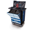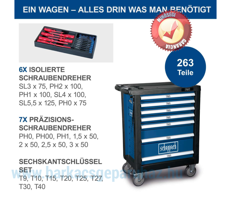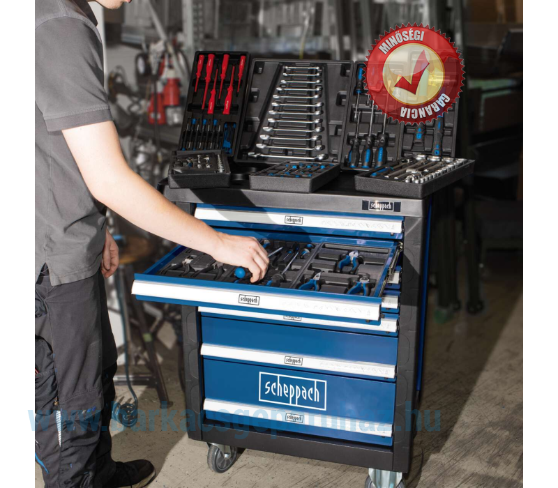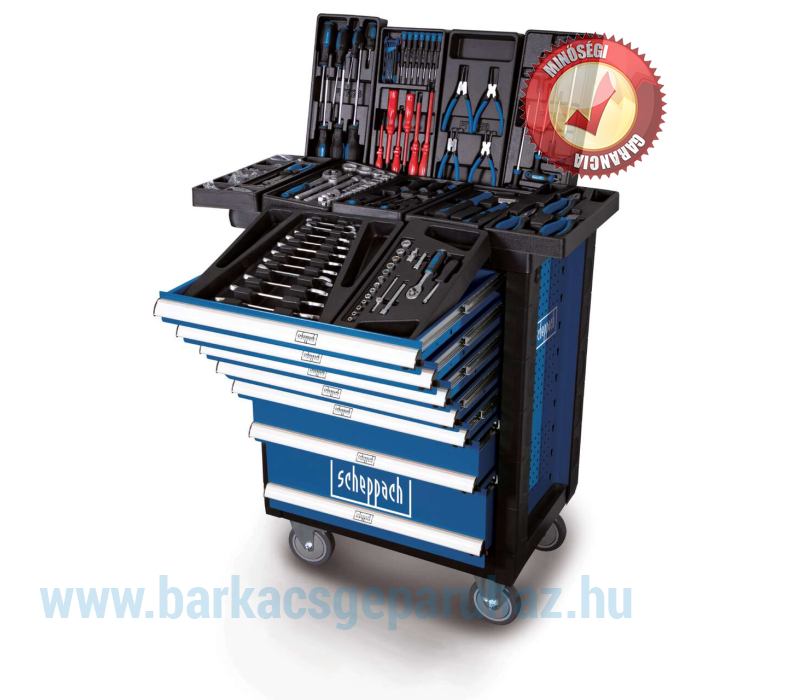 Mindig legyen kéznél a megfelelő szerszám. A Scheppach TW1000 műhelykocsival egy teljesen felszerelt, kerekeken guruló műhelyt kapsz. Ez a masszív és tartós műhelykocsi egy 263 darabos szerszámkészlettel van felszerelve. Minden szerszámnak megvan a maga helye, és mindig gyorsan kéznél van. Négy nagyméretű, reteszelhető görgőjének köszönhetően a kocsi könnyen szállítható és biztonságosan leparkolható. A nagyméretű tárolóhely egy extra tartóval lehetővé teszi a gyakran használt alkatrészek biztonságos tárolását.