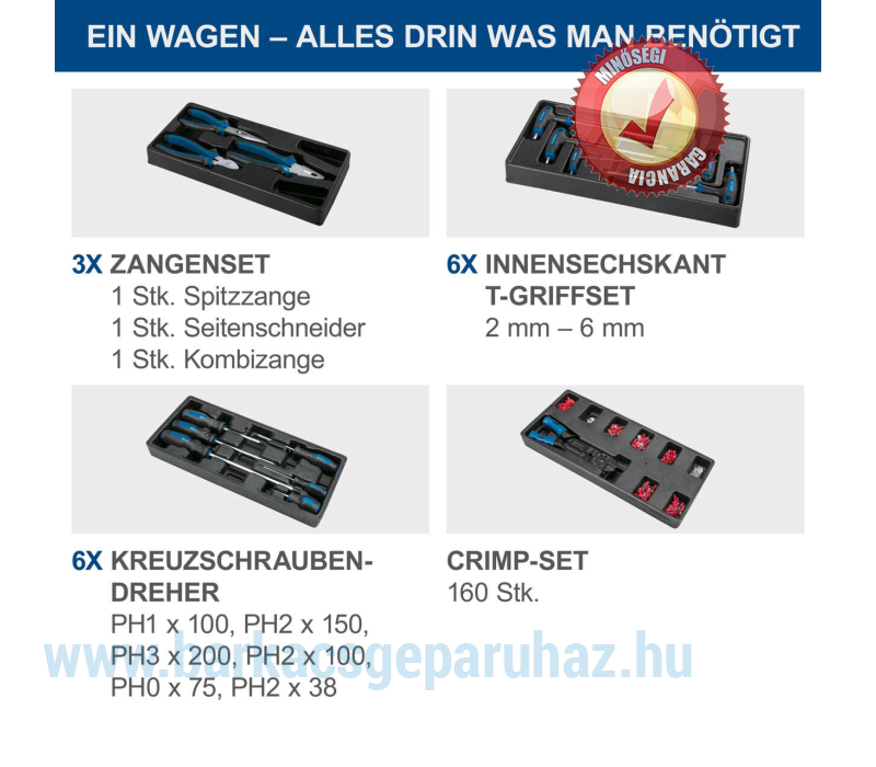 - 6 db T-nyelű imbuszkulcs (6 x 150 mm / 5 x 150 mm / 4 x 150 mm / 3 x 100 mm / 2,5 x 100 mm / 2 x 100 mm)
