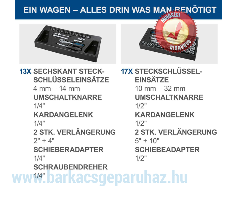 - 13 db dugókulcs betét (4 / 4,5 / 5 / 5,5 / 6 / 7 / 8 / 9 / 10 / 11 / 12 / 13 / 14")