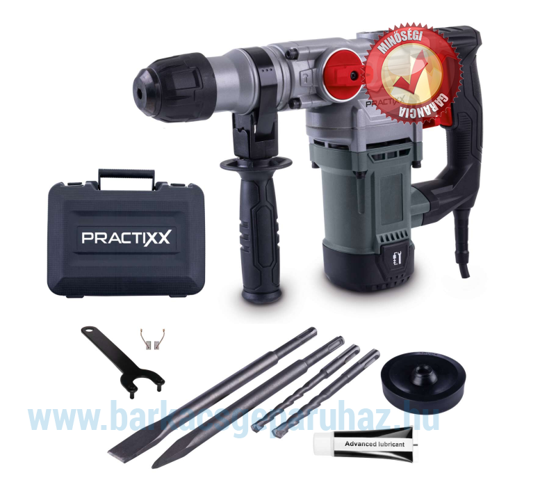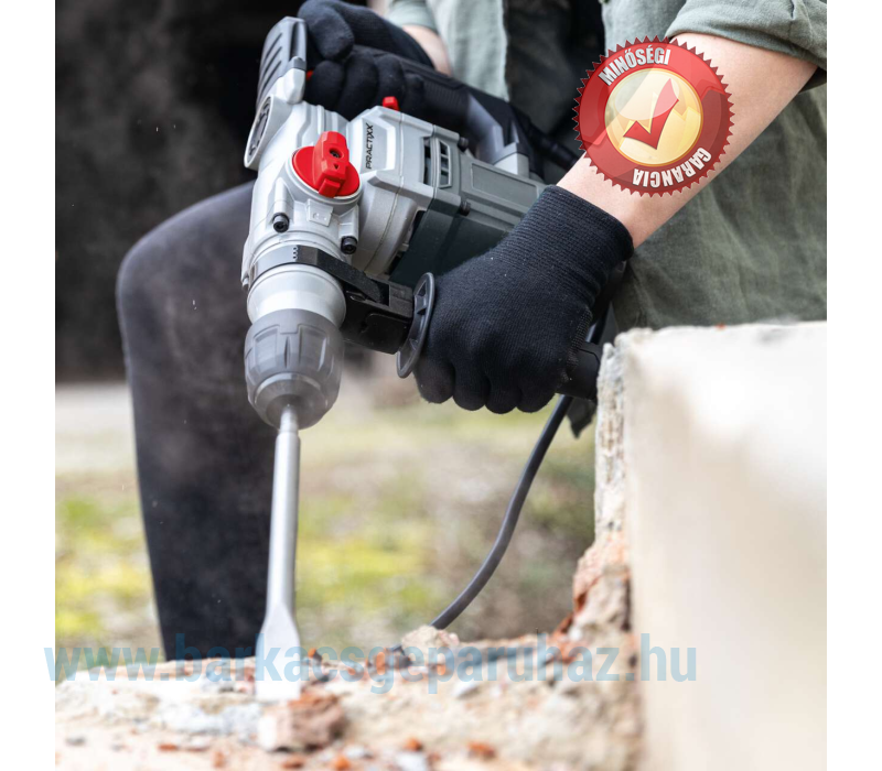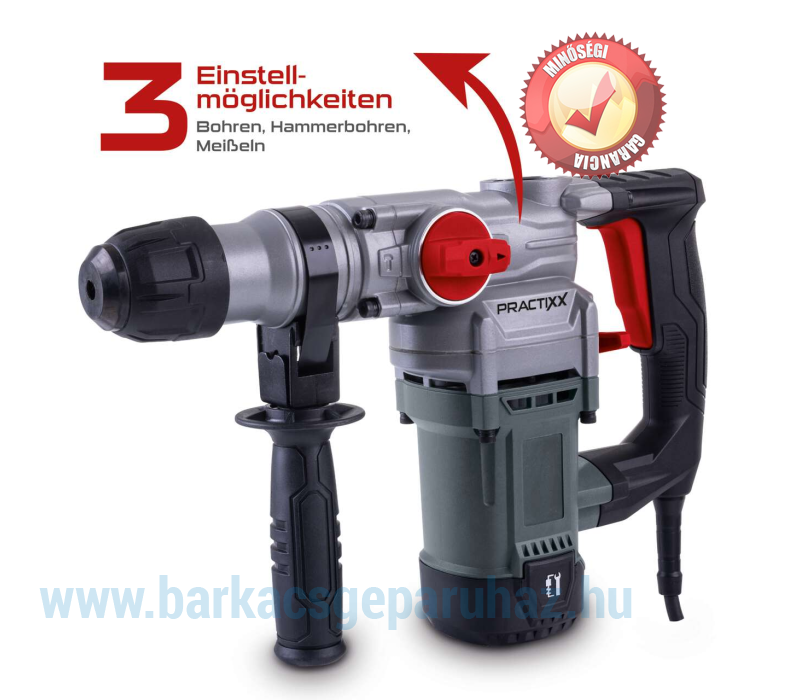 A Practixx nagy teljesítményű PX-BH-5 elektromos ütvefúrója praktikus 3 az 1-ben funkciójával ideális kő, beton, csempék vagy tégla megmunkálásához. A központi választókapcsoló lehetővé teszi a három funkció egyikének gyors és szerszám nélküli kiválasztását: ütés nélküli fúrás, ütvefúrás aktivált ütőmechanizmussal és vésés. Az 5 joule ütőerővel és az akár 4250 ütés/perc sebességgel a PX-BH-5 még a legnehezebb kihívásoknak is megfelel. A szerszámcsere gyors és egyszerű az SDS-Plus szorítórendszernek köszönhetően, és egyáltalán nem igényel szerszámot.